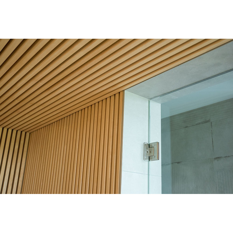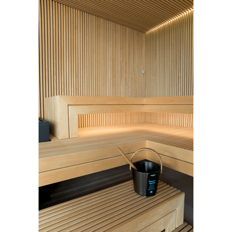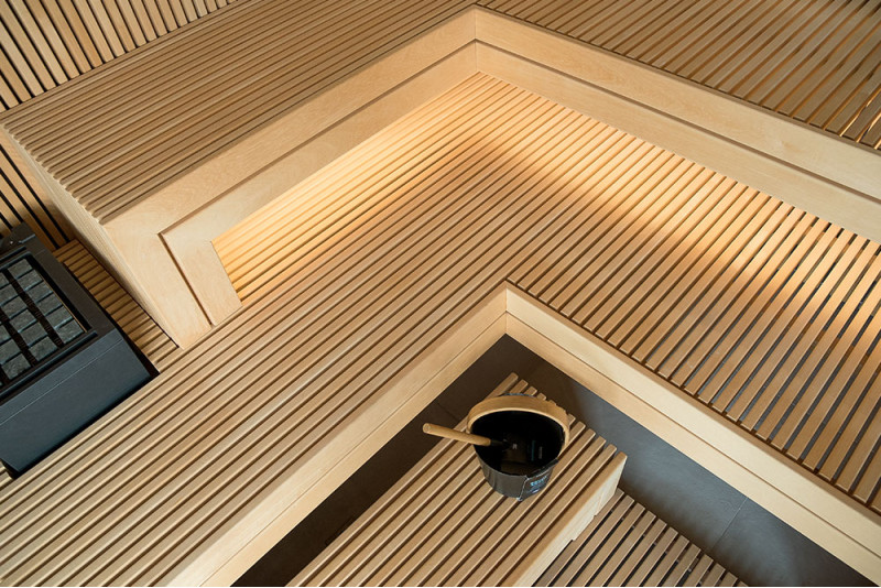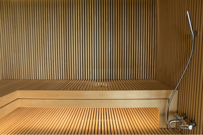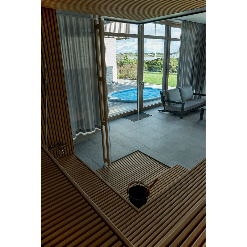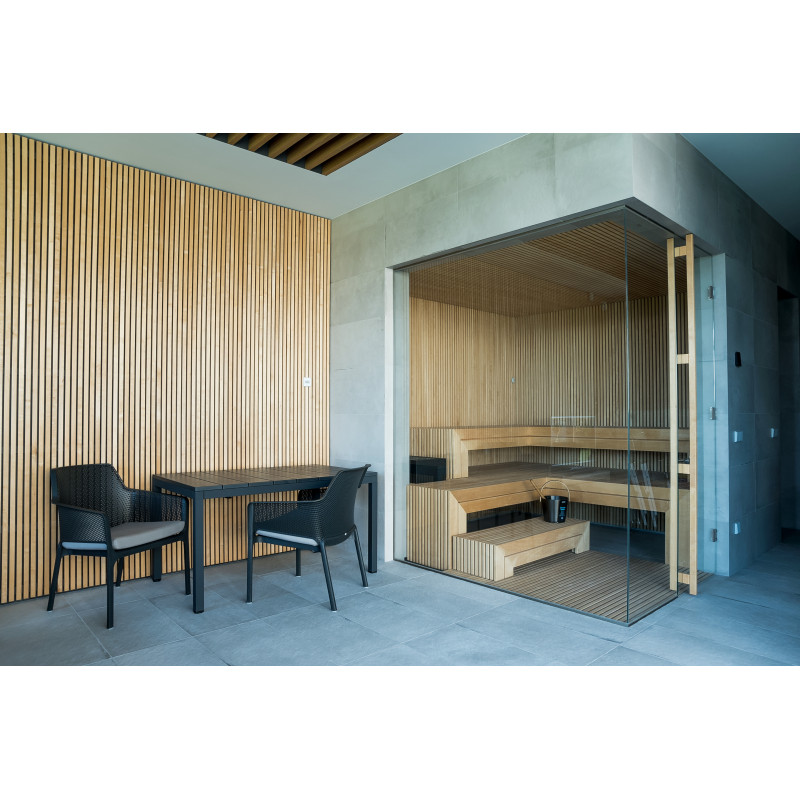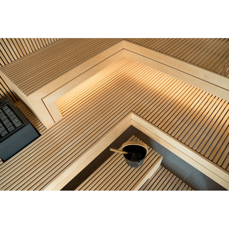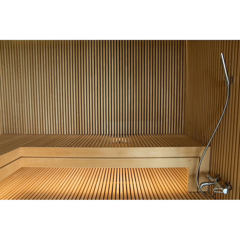 A választott nagyon világos fa az abachi. Lágy és alacsony hőfokon. Ez a pozitív tulajdonság lehetővé teszi, hogy kényelmesen élvezze a szauna örömeit. A száloptikás világítás kiemeli a fa szerkezetét. A nyugágyak és a mennyezet alatt felszerelt világítás a teljes falon vízszintesen kanyarogva kényelmesen megvilágítja az áttört facsíkokat.