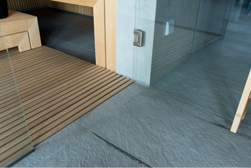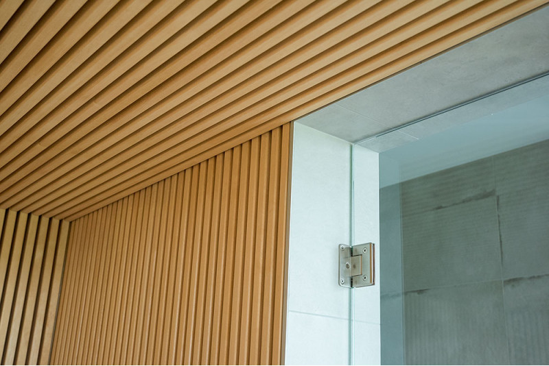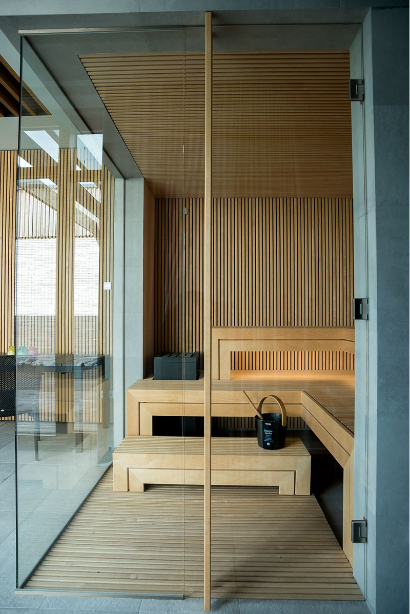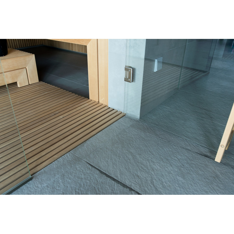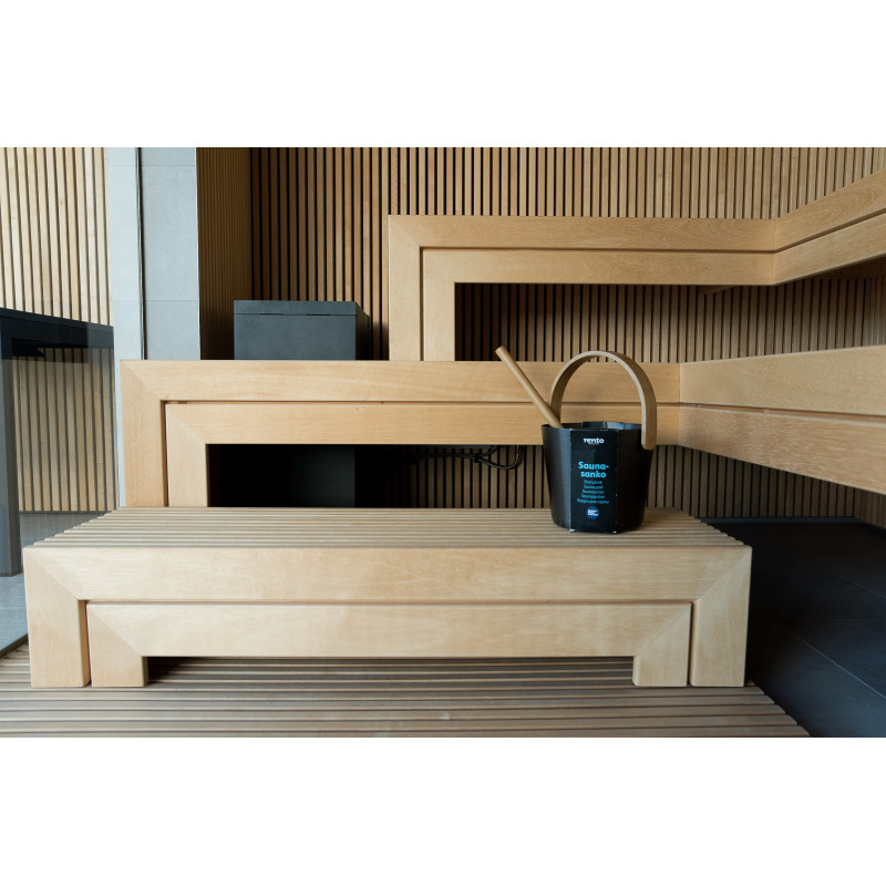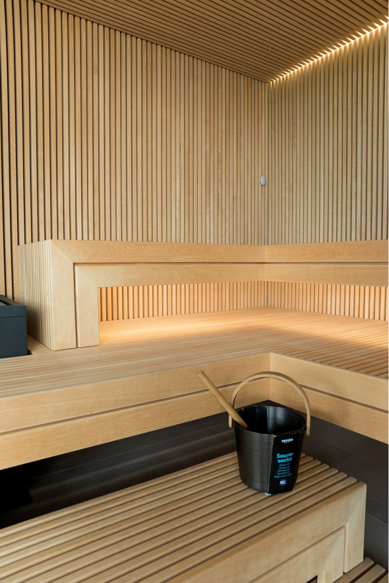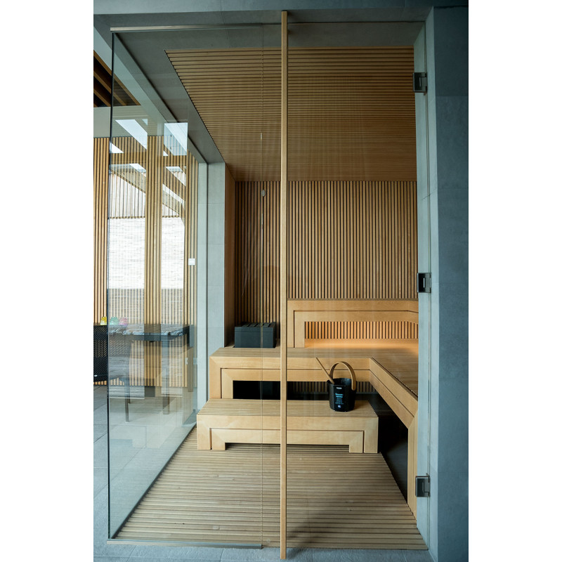 A választott nagyon világos fa az abachi. Lágy és alacsony hőfokon. Ez a pozitív tulajdonság lehetővé teszi, hogy kényelmesen élvezze a szauna örömeit. A száloptikás világítás kiemeli a fa szerkezetét. A nyugágyak és a mennyezet alatt felszerelt világítás a teljes falon vízszintesen kanyarogva kényelmesen megvilágítja az áttört facsíkokat.