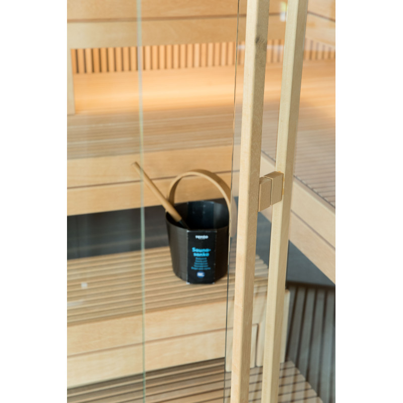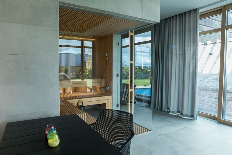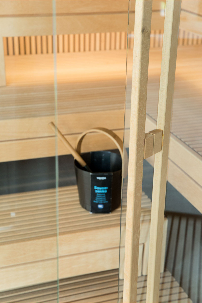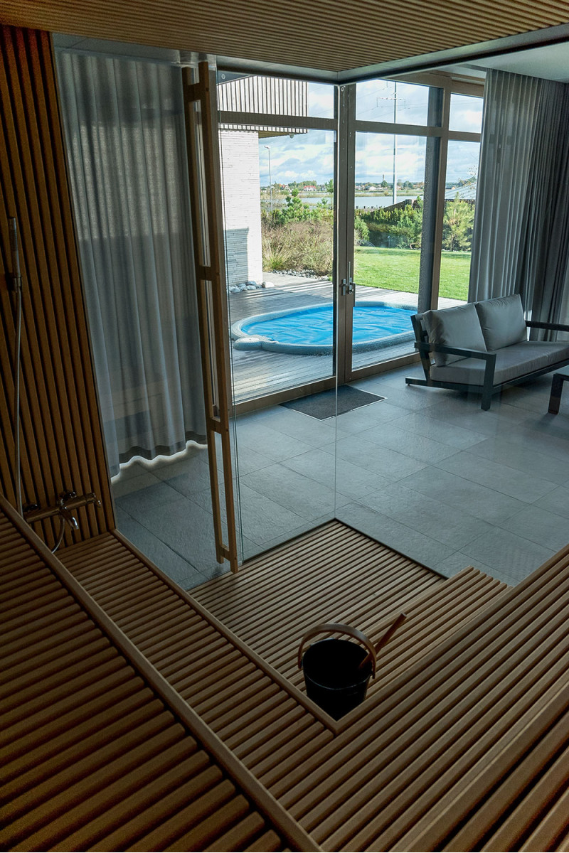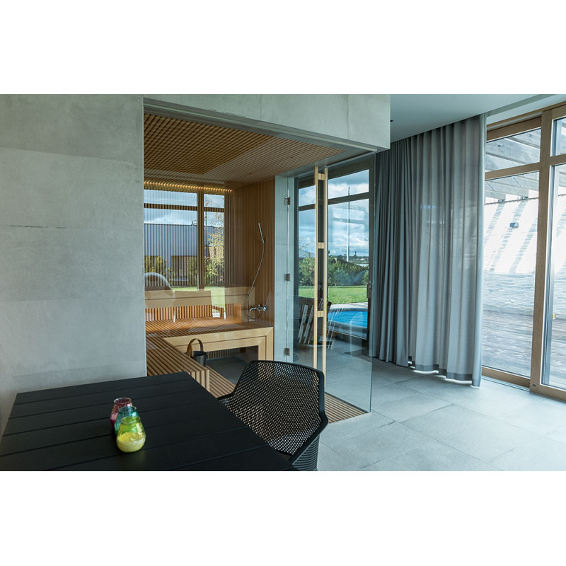 Ennek a szaunának az exkluzív dizájnja áttört fa brüsszeli díszítéssel jött létre. A szaunában ismétlődő famotívumokat is alkalmaztak. Tiszta és harmonikus tér alakult ki, nem szauna üveges kirakat választja el, hanem éppen ellenkezőleg - kitágítja és megnyitja a kilátást a csodálatos természetre.