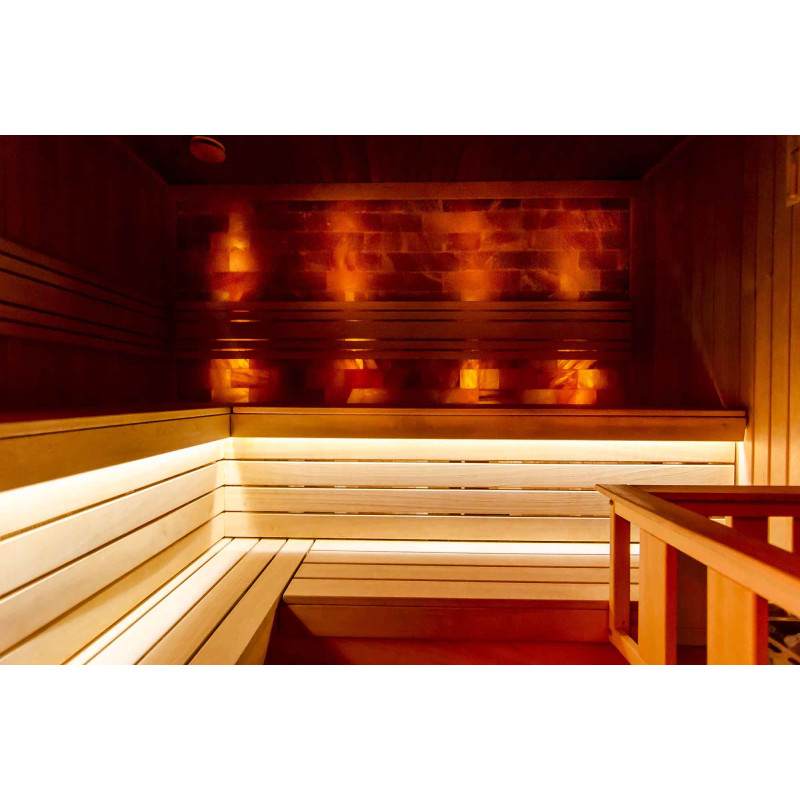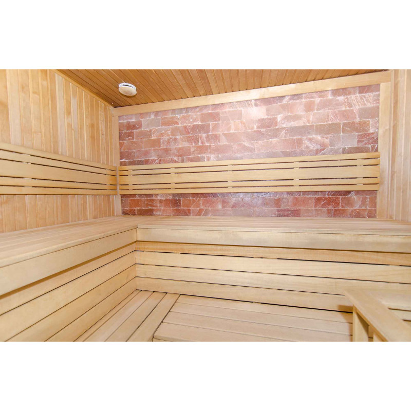 A szaunában található himalájai só nemcsak eredetinek tűnik, hanem számos pozitív tulajdonsággal is rendelkezik egészségünkre nézve. Segít az eltömődött arcüregek esetén, salakmentesít, szabályozza a vérnyomást, csökkenti az allergiás és asztmás tüneteket, javítja a hangulatot és energiát ad. A himalájai só javítja a beltéri levegő minőségét, semlegesíti az elektromágneses sugárzást, csökkenti a levegőben lévő statikus elektromosságot.