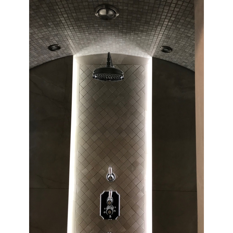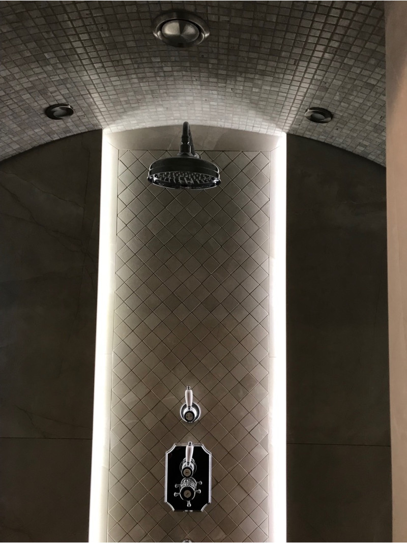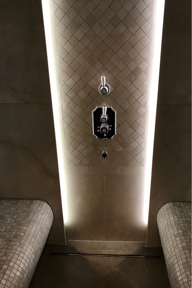 Beépített LED szalag a nyugágyak alatt, a falakon és négy csillár a mennyezeten.