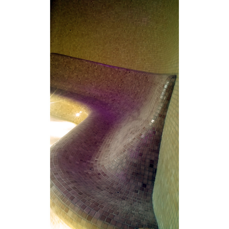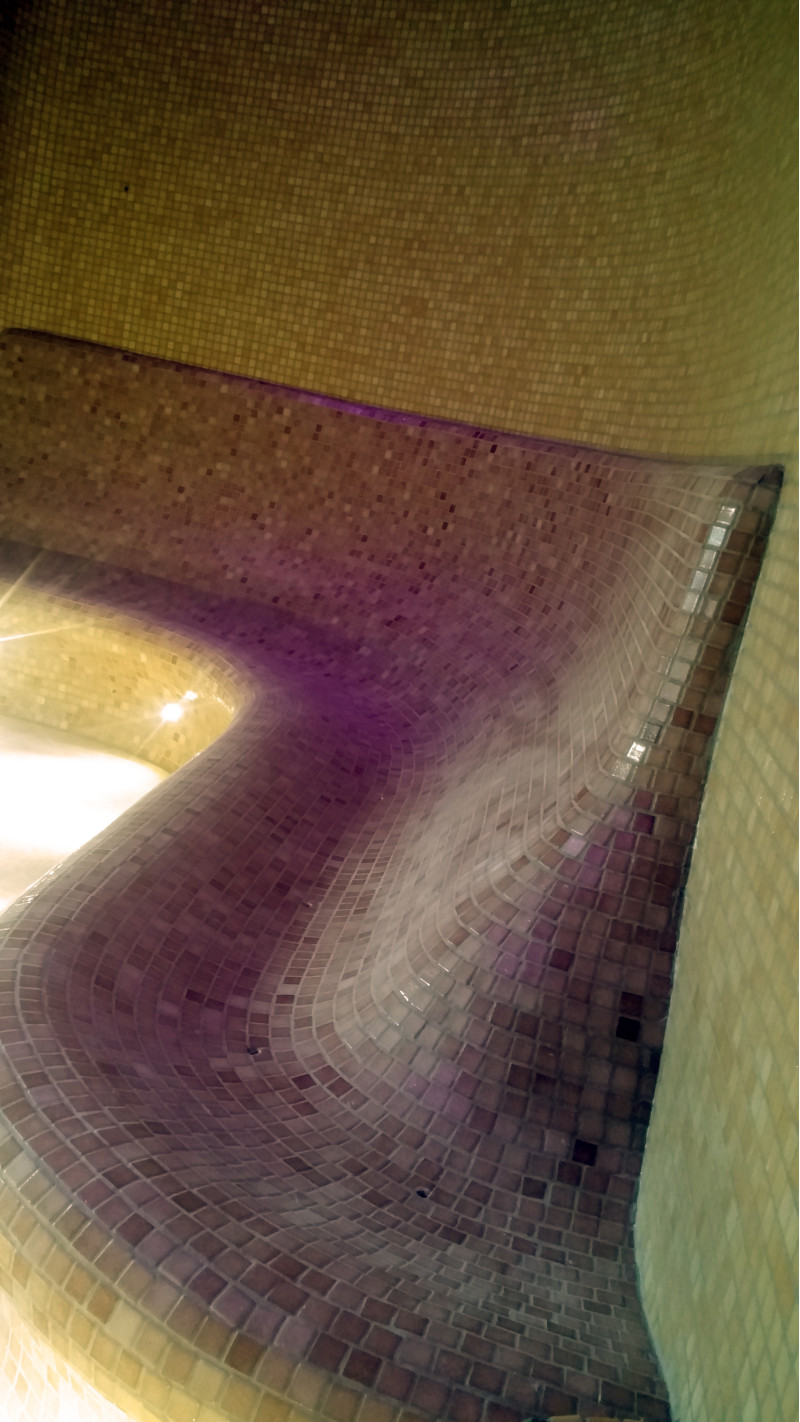 Befejezés - zúzott üvegmozaik csempével díszített padlók, falak, padok.