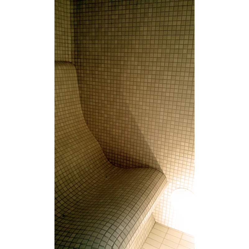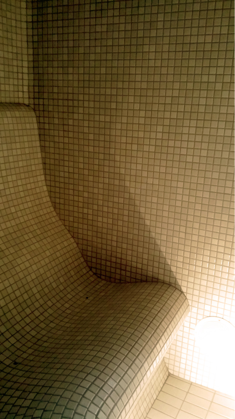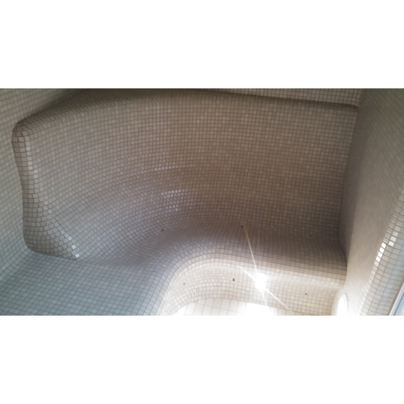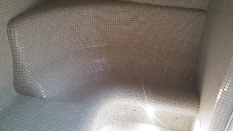 Befejezés - a szauna mennyezetét, falait és napozóágyait zúzott üvegmozaik csempék díszítik. A padló hosszú élettartamú csempe.