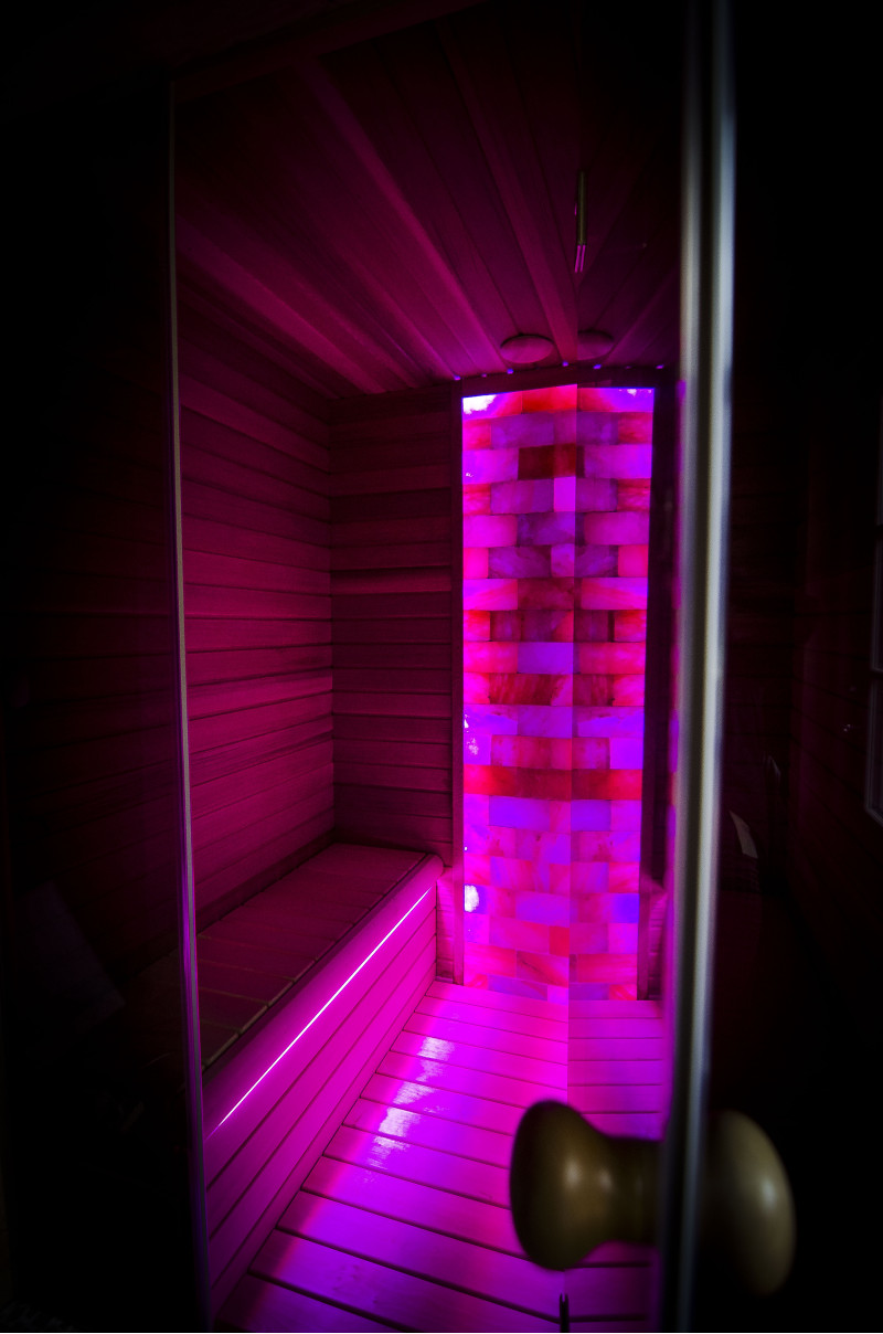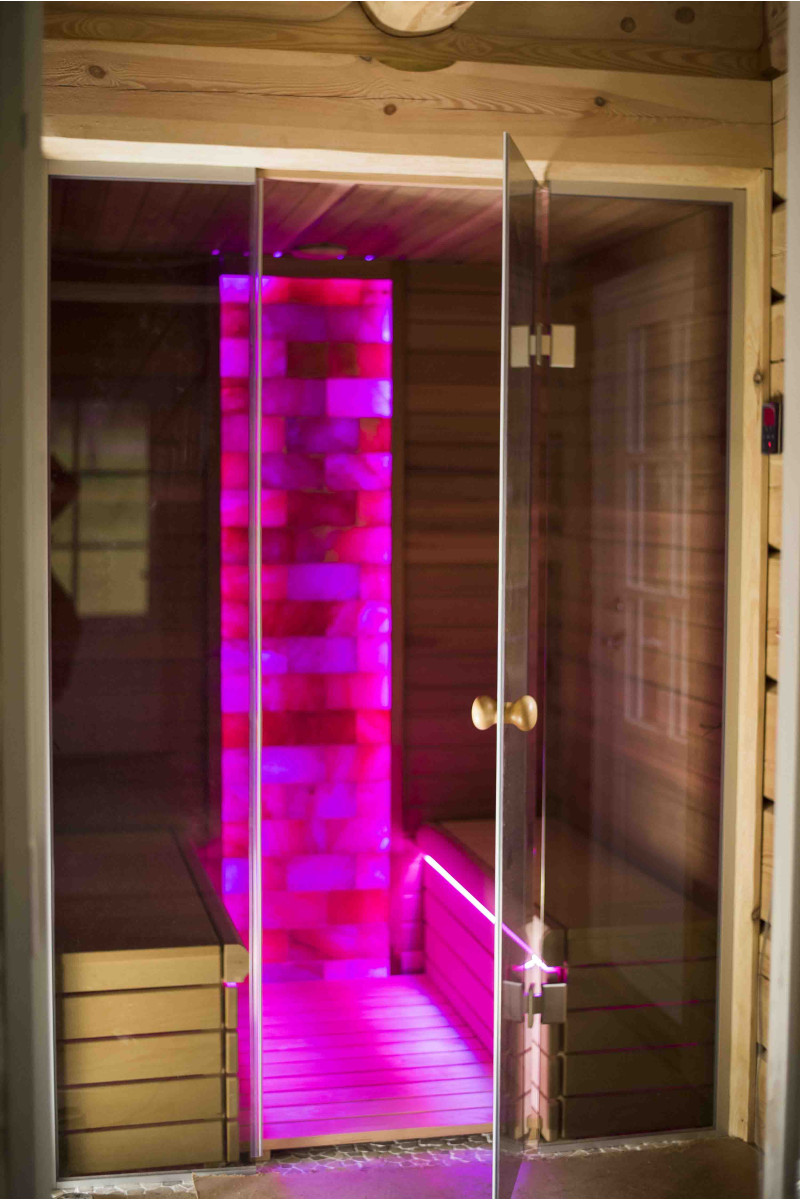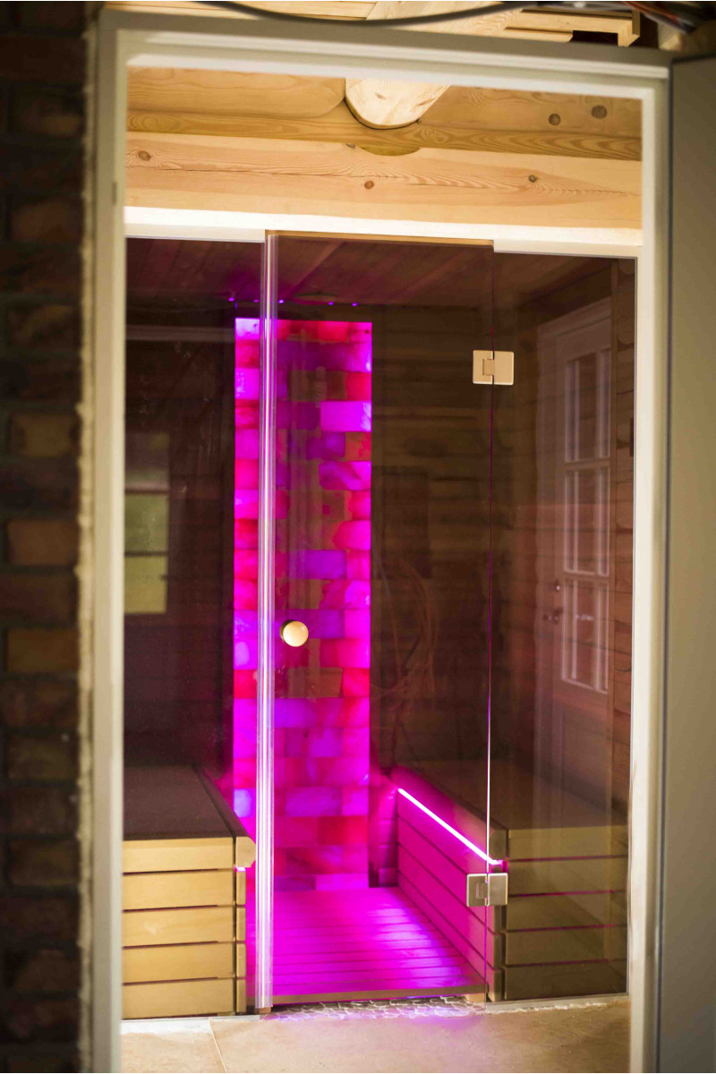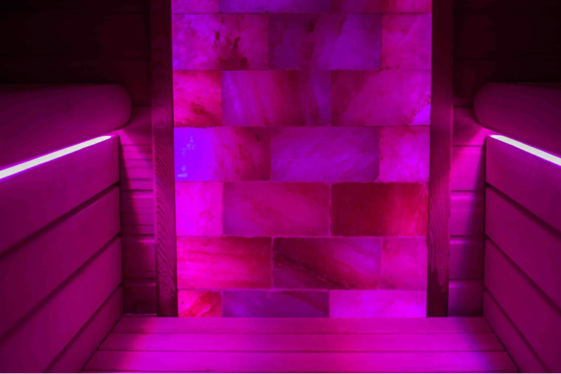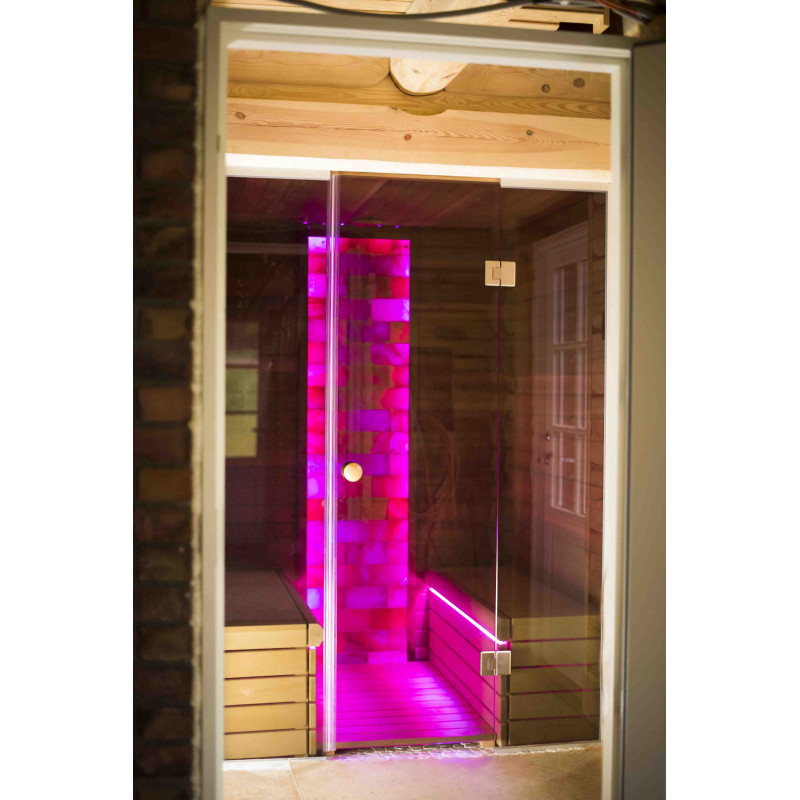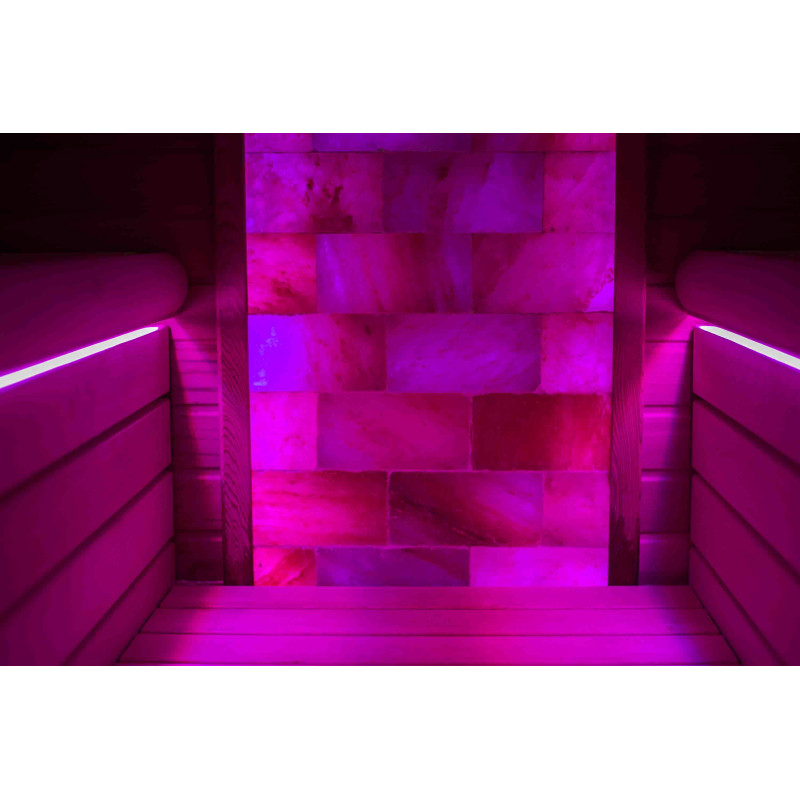 A szauna díszítésére választott himalájai sótéglafal a beépített színes RGB világítással, vezeték nélküli színváltóval vezérelve hangulatos környezetet teremt és tovább fokozza a szauna hatását.