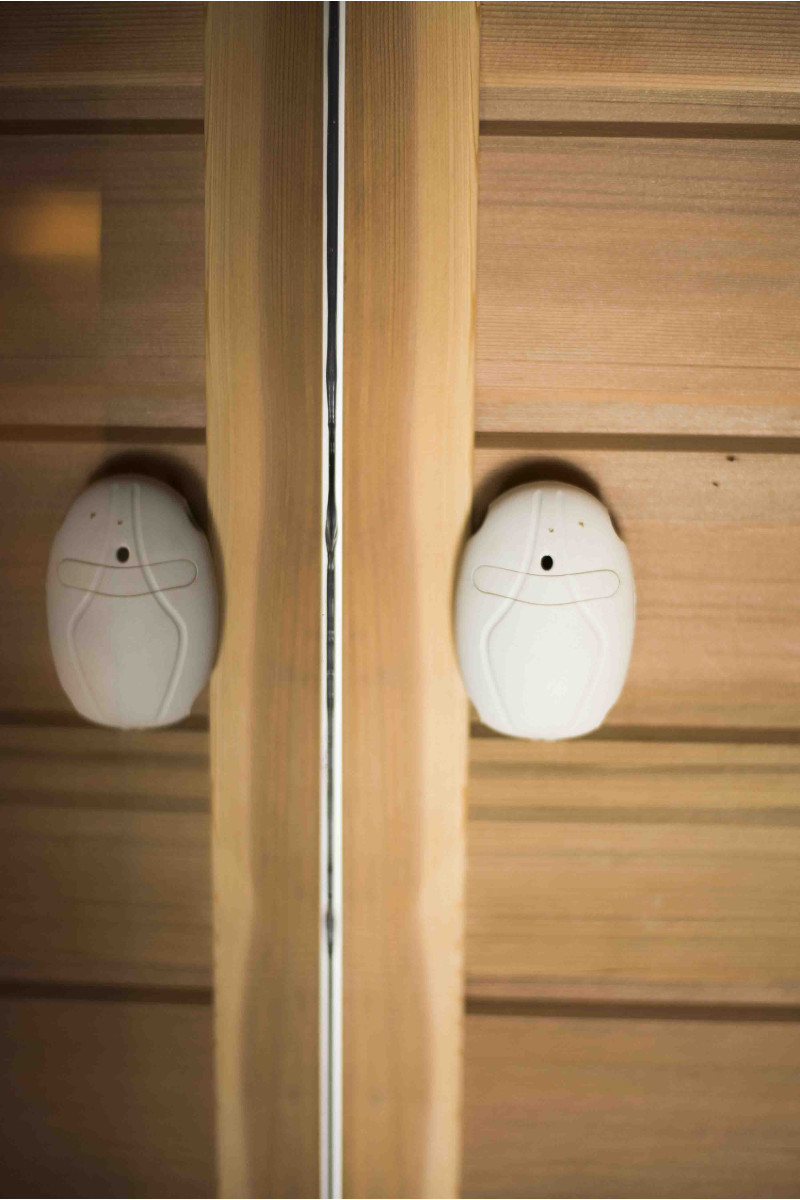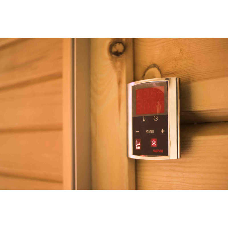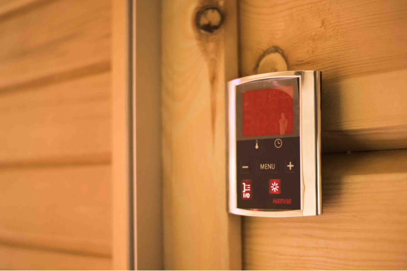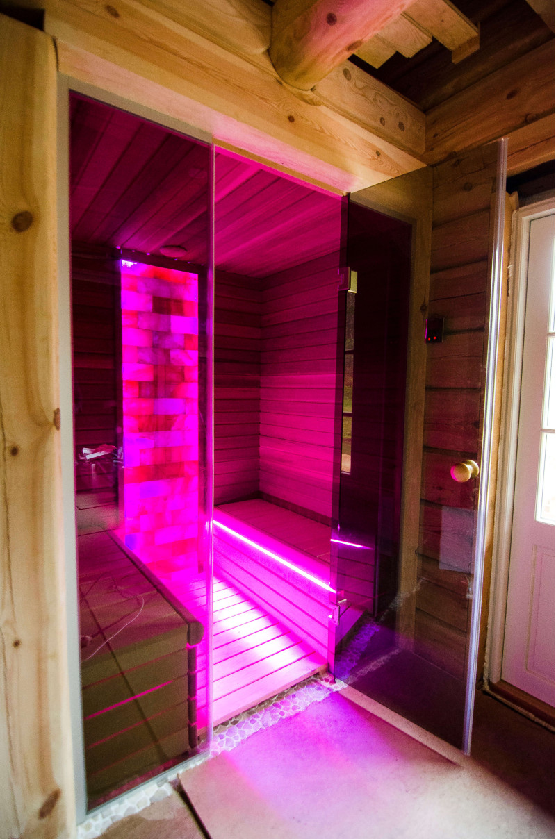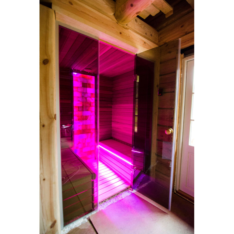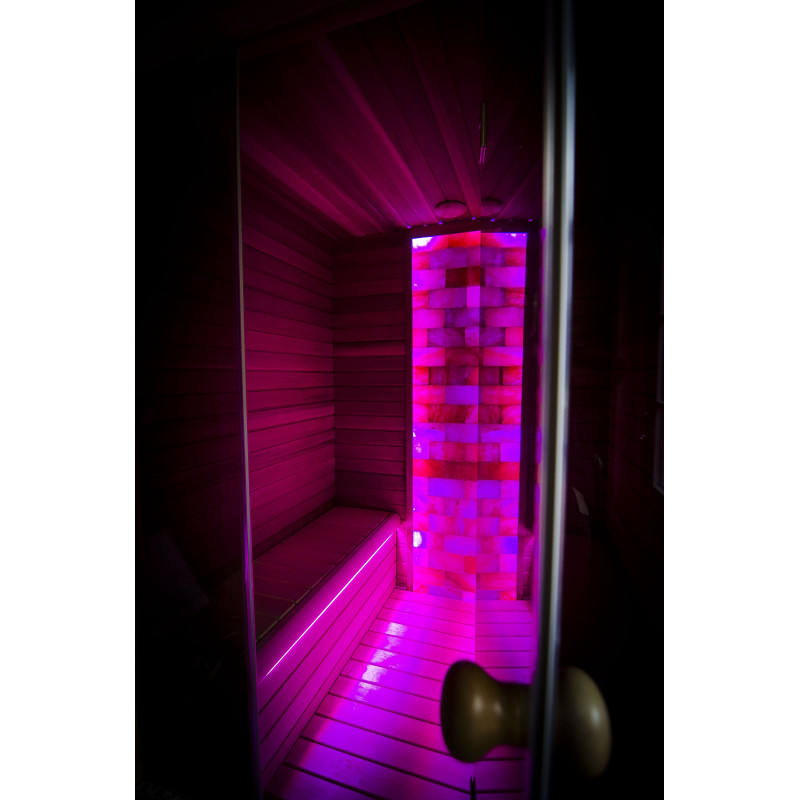 A szauna díszítésére választott himalájai sótéglafal a beépített színes RGB világítással, vezeték nélküli színváltóval vezérelve hangulatos környezetet teremt és tovább fokozza a szauna hatását.
