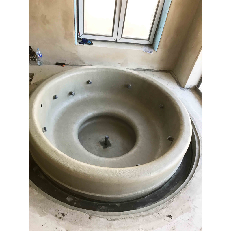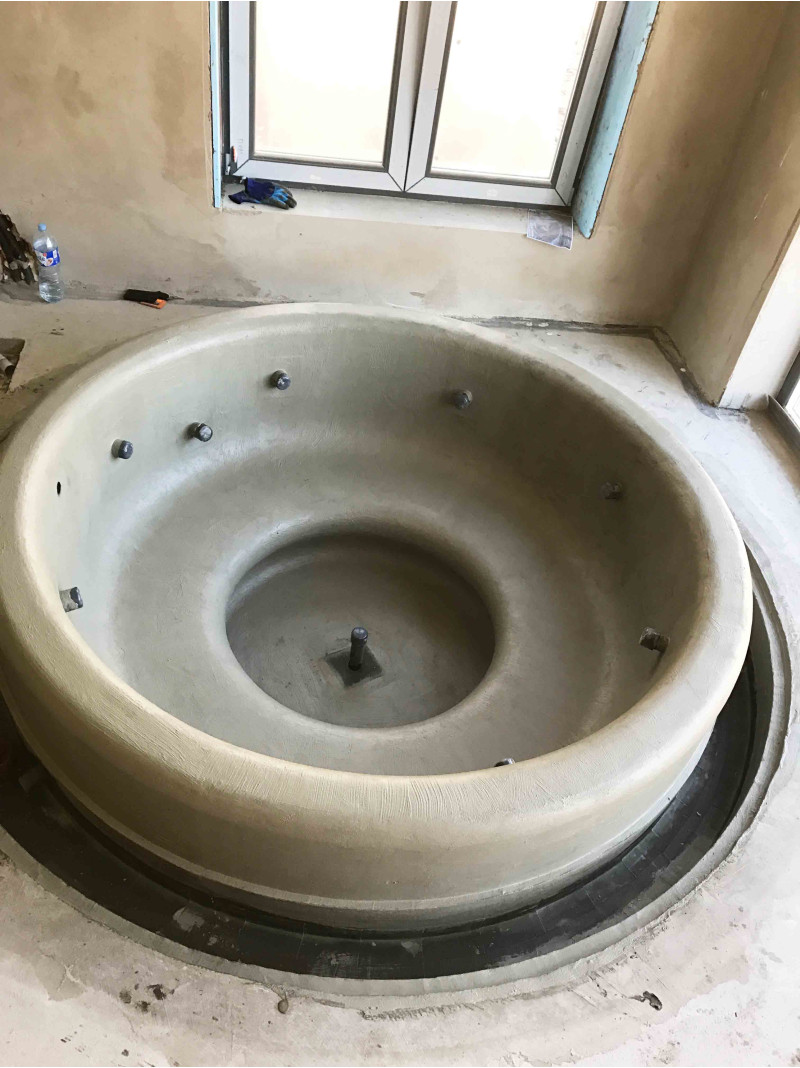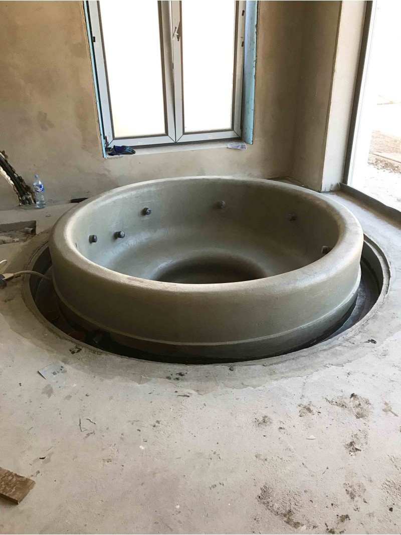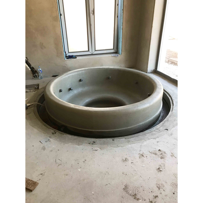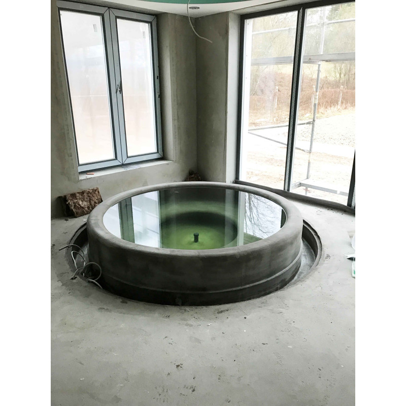 A medence kerek alakú, az egész medence körül ülőhelyek találhatók. A medence belső felületeit folyamatos vágó XPS 300 polisztirol felhasználásával alakítottuk ki. Rendkívül erős, nedvesség- és nyomásálló anyag.