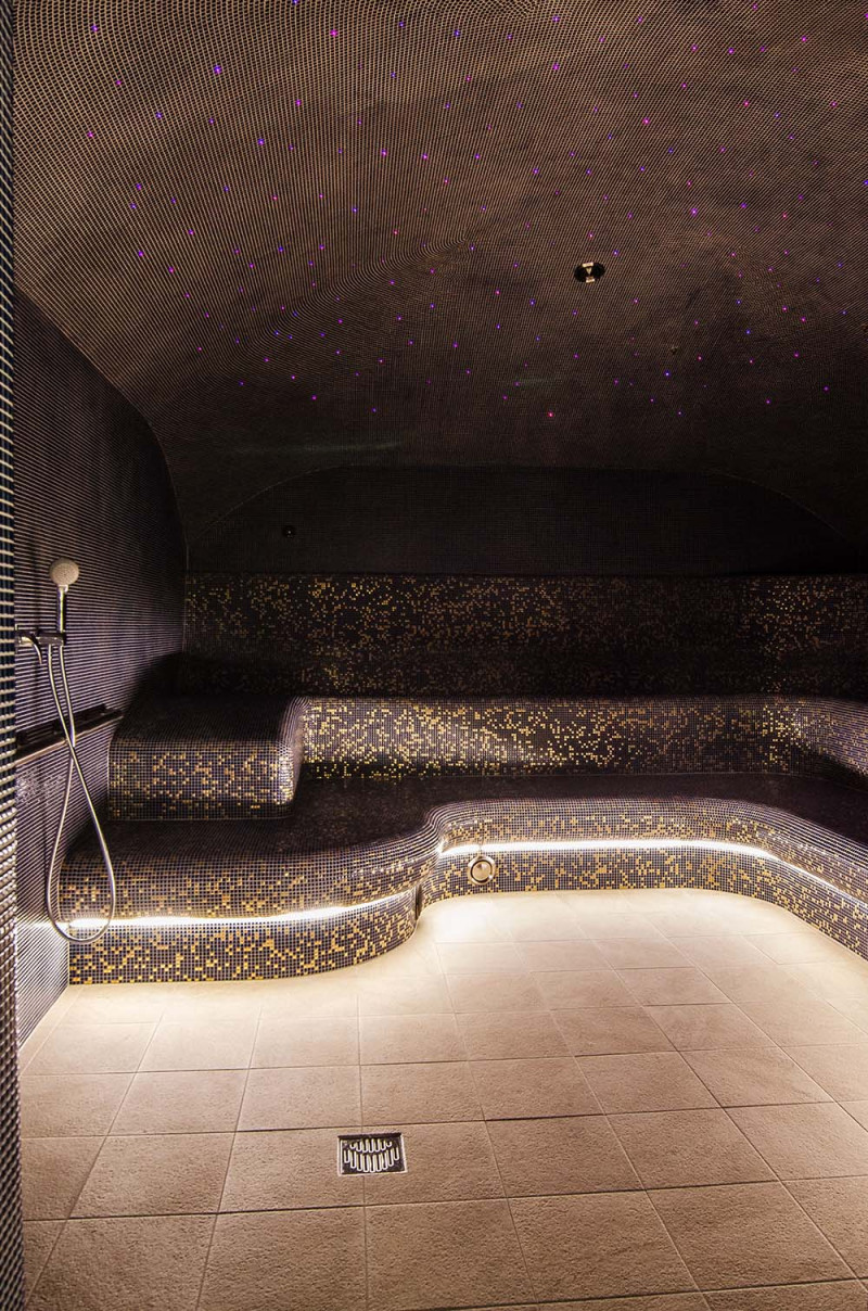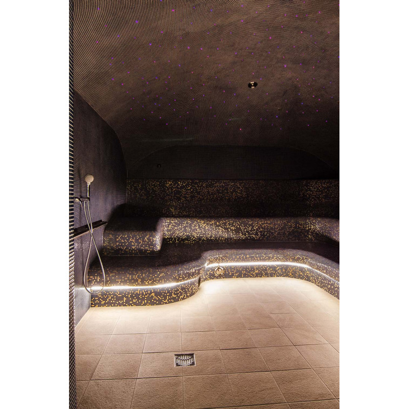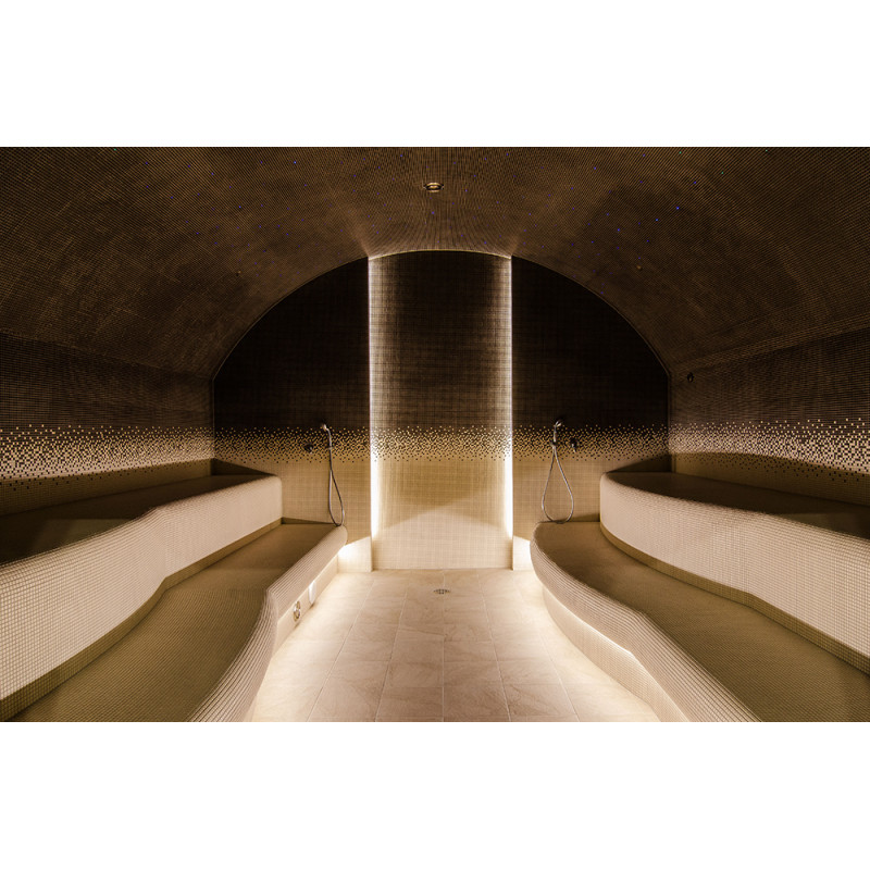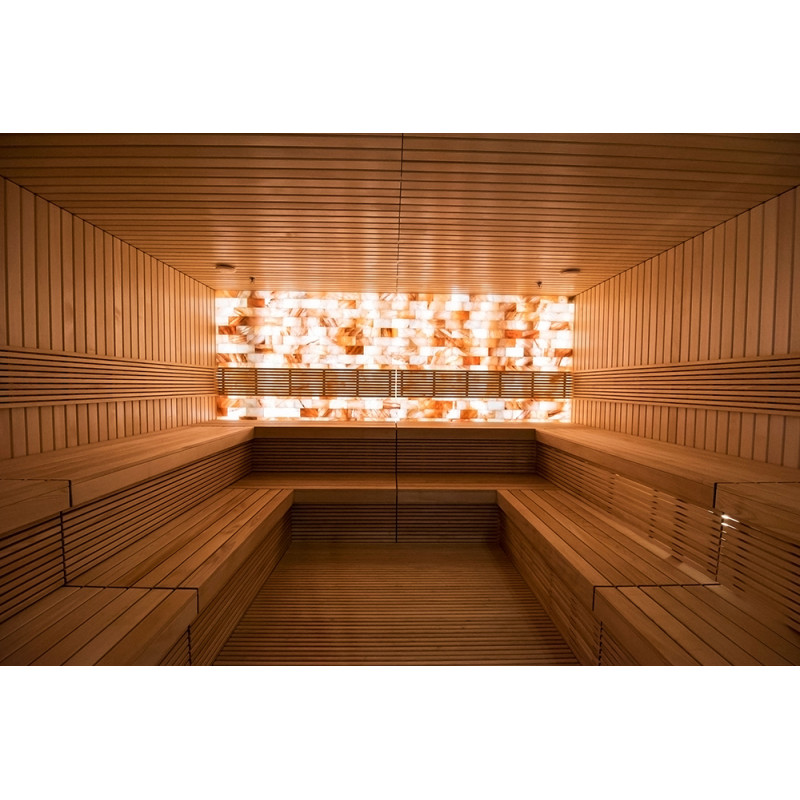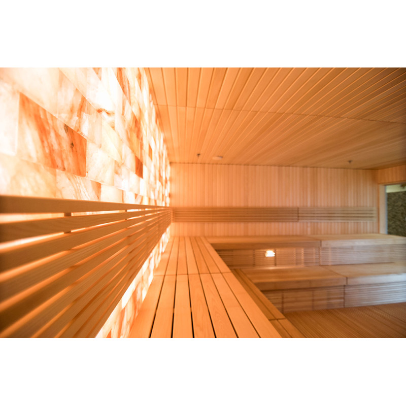 - Az ágyak alá nedvesség- és hőmérsékletálló lámpatestek vannak felszerelve. A LED -es világítás a himalájai sófal mögé van felszerelve.