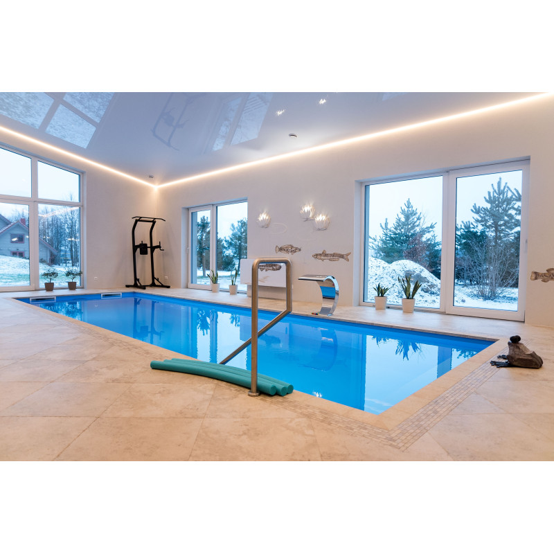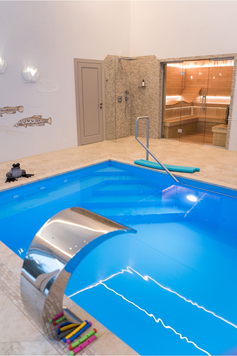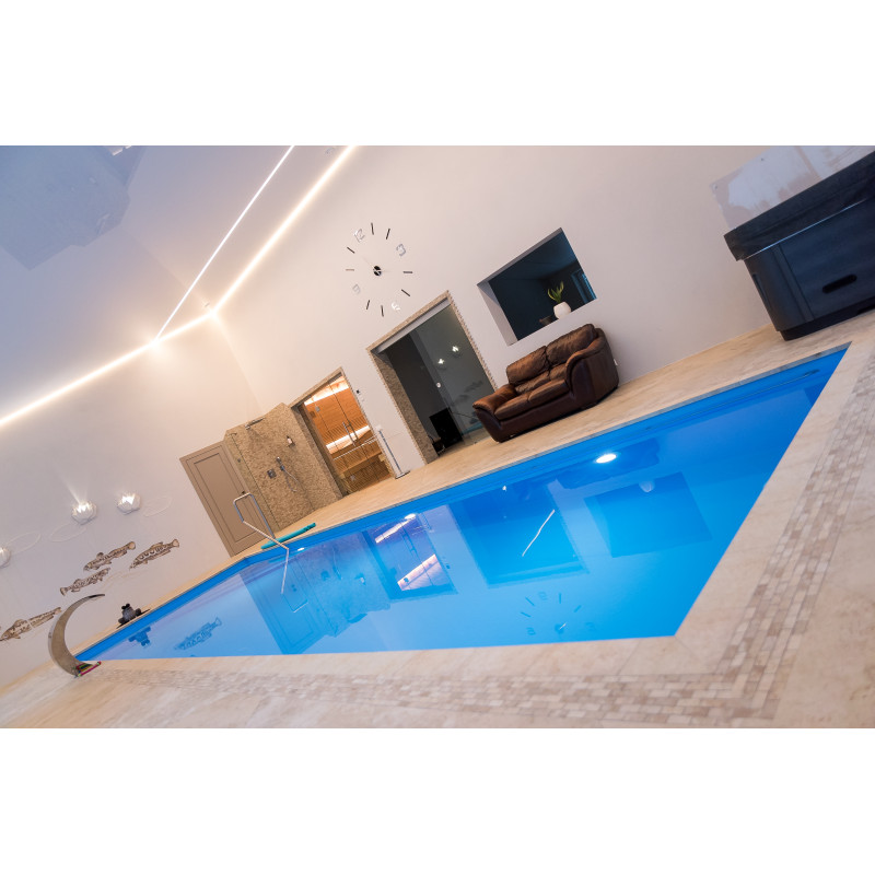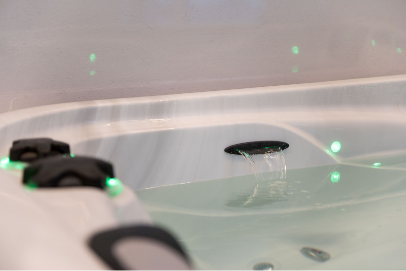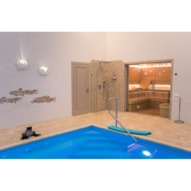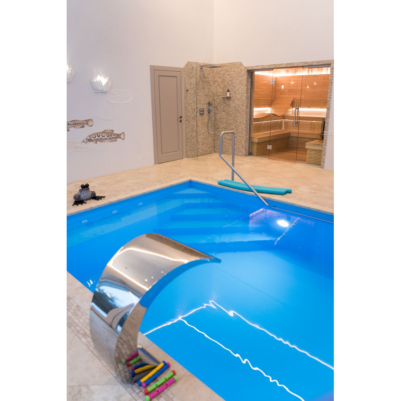 Úszóárammal, vízeséssel, masszázspaddal, korláttal, lépcsővel és víz alatti világítással felszerelt.