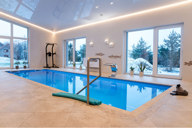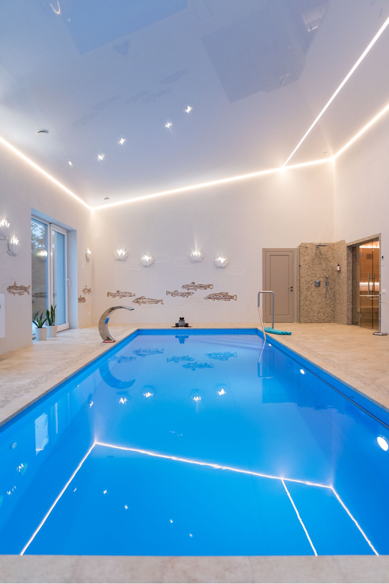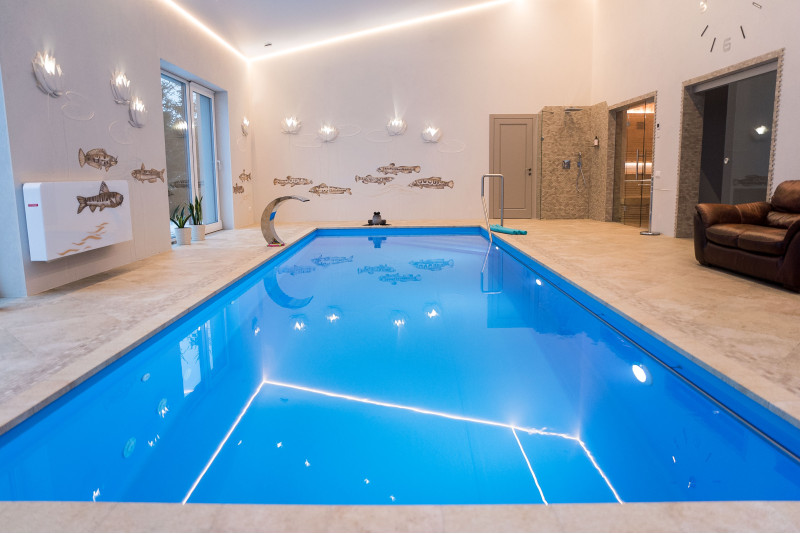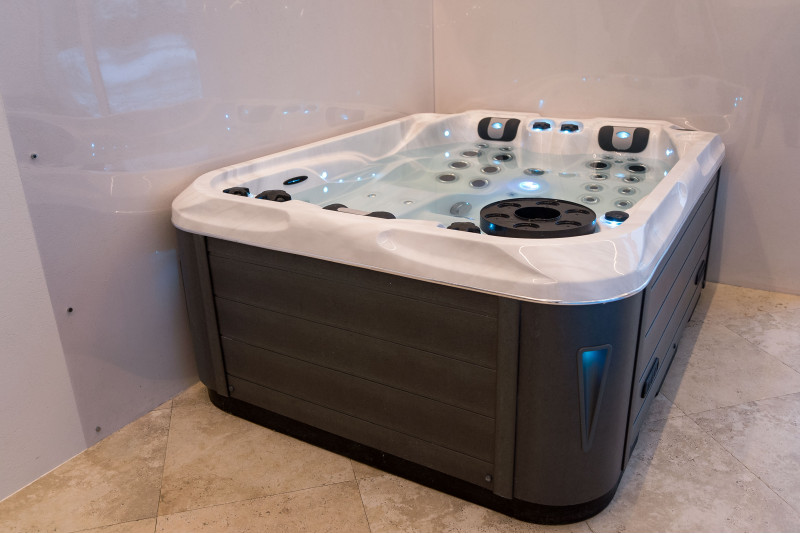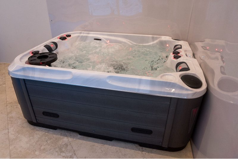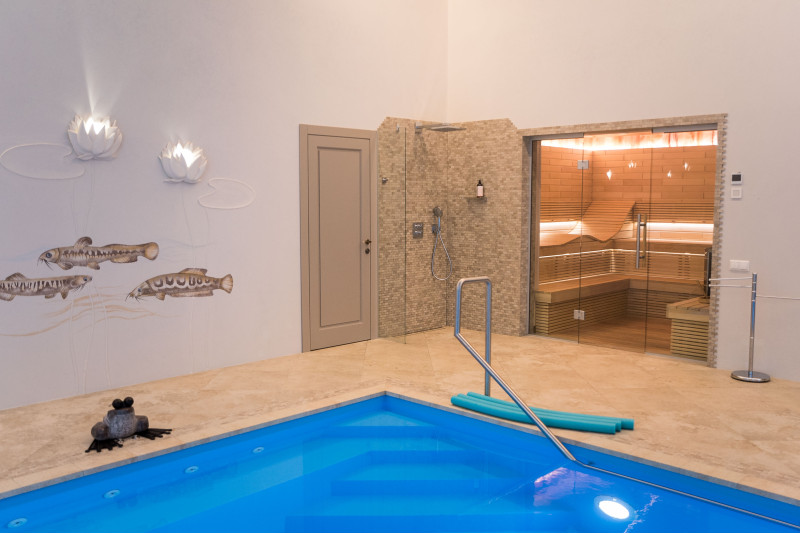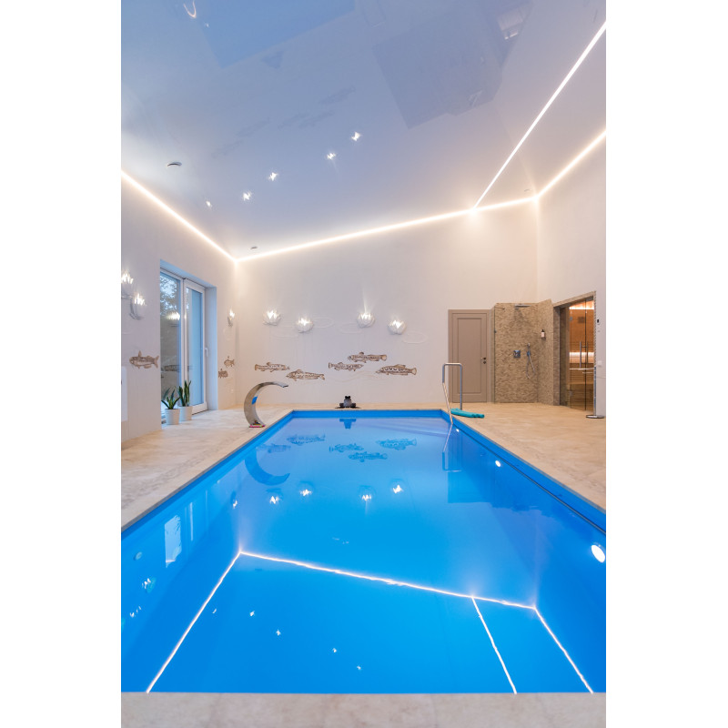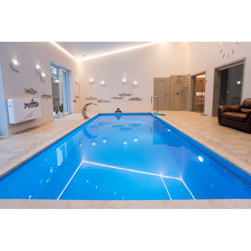 Úszóárammal, vízeséssel, masszázspaddal, korláttal, lépcsővel és víz alatti világítással felszerelt.