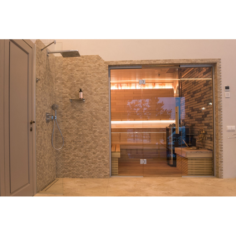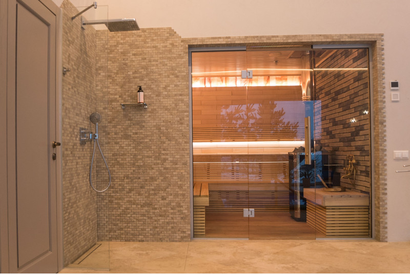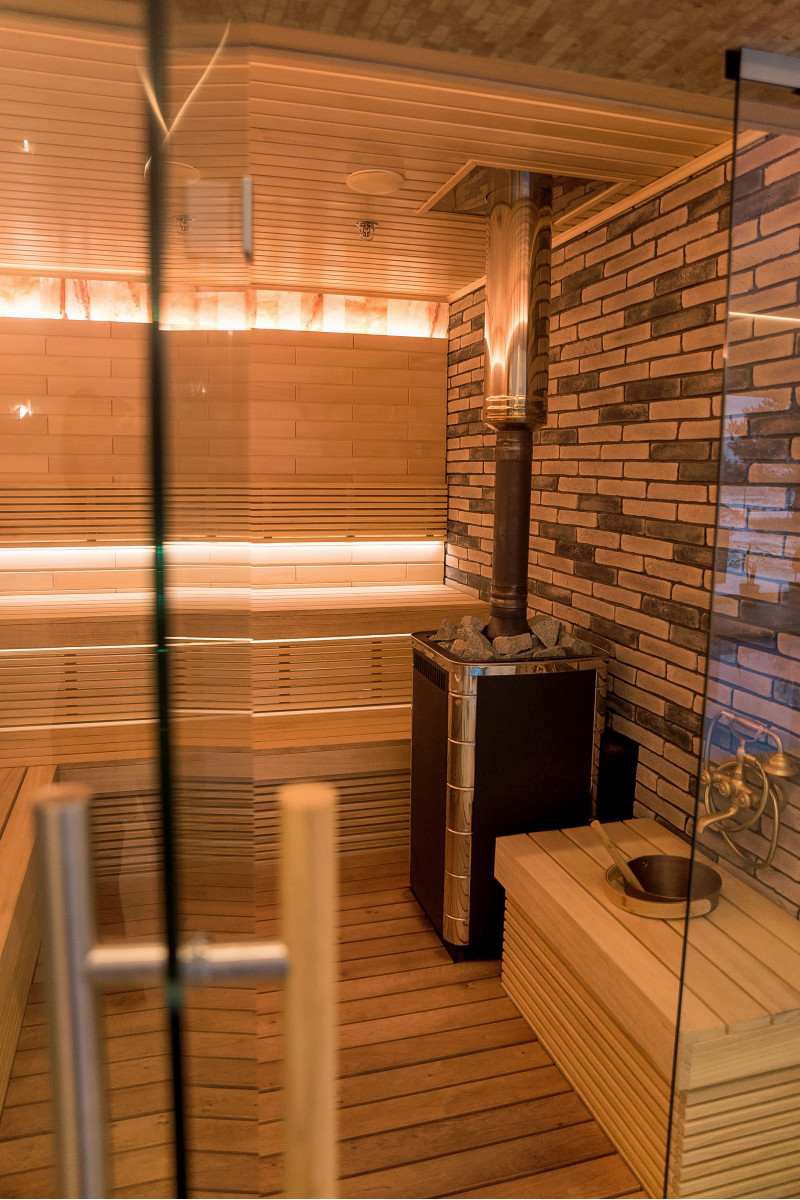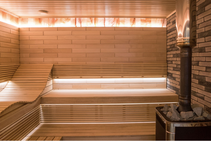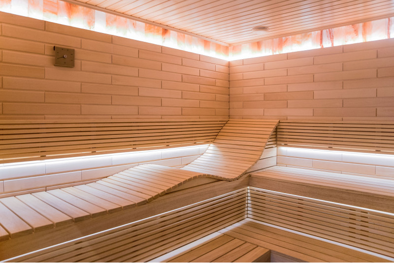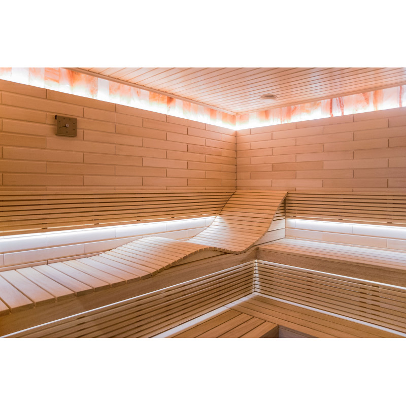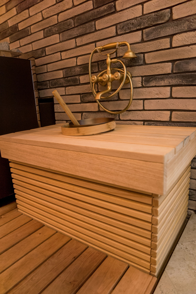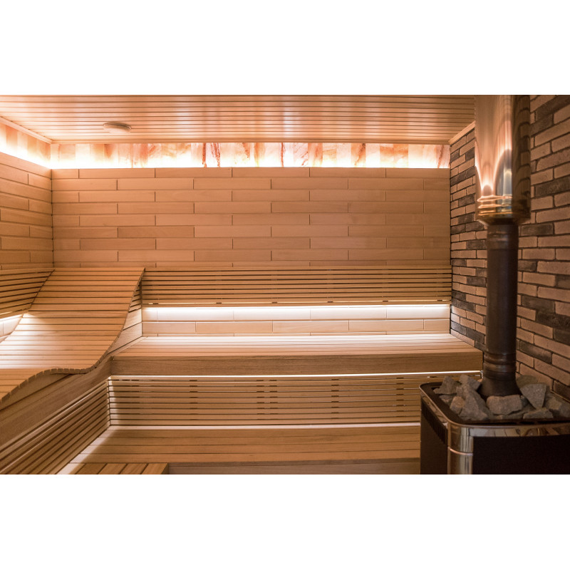 A szauna belső dekorációja - hársfa, ágydeszkák, padlórácsok - abachi fa. Az ágyak, támasztékok és falak olajjal impregnáltak és lakkoztak.