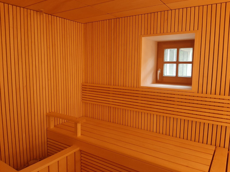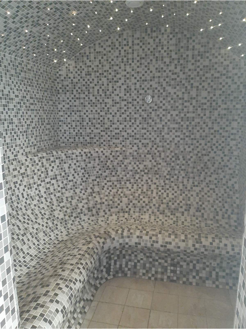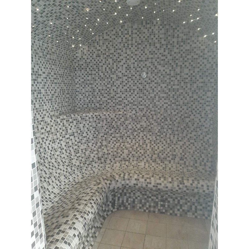 - Gőzszauna - olyan használt anyagok, amelyek rendkívül magas hőmérsékletnek és nagyon magas páratartalomnak ellenállnak. A mennyezet íves, hogy a gőzkondenzátum ne csöpögjön a szaunázókra. A dekorációhoz csempe, a mennyezet optikai világítása pedig csillagos ég hatást kelt. A padok különösen kényelmes formájúak.
