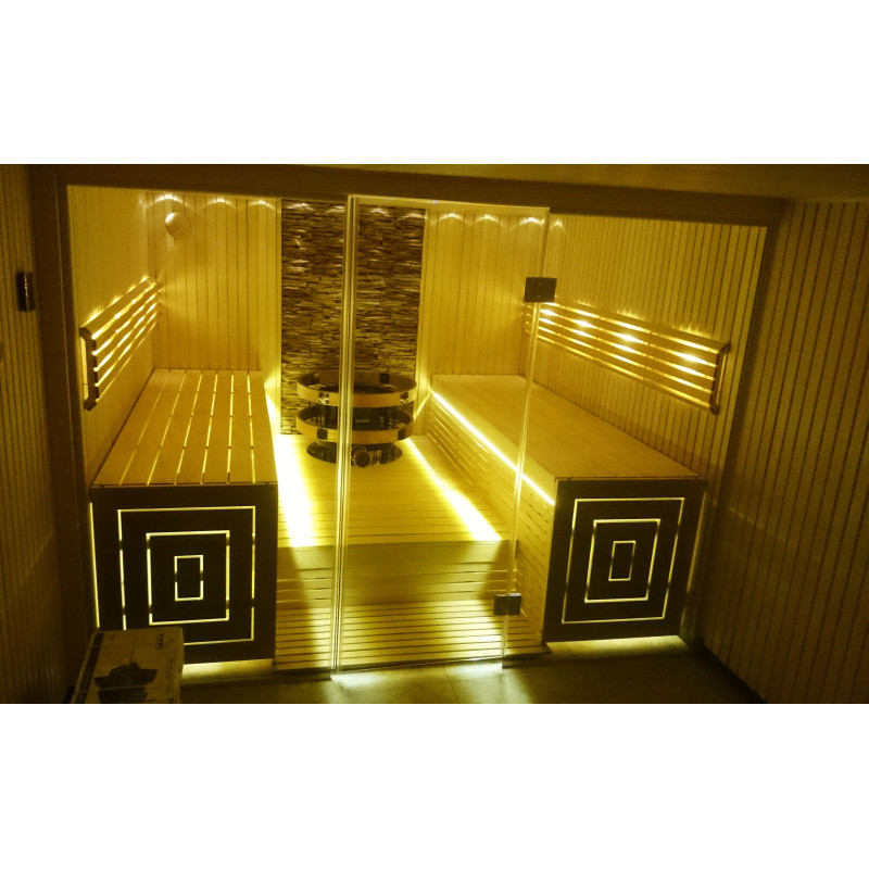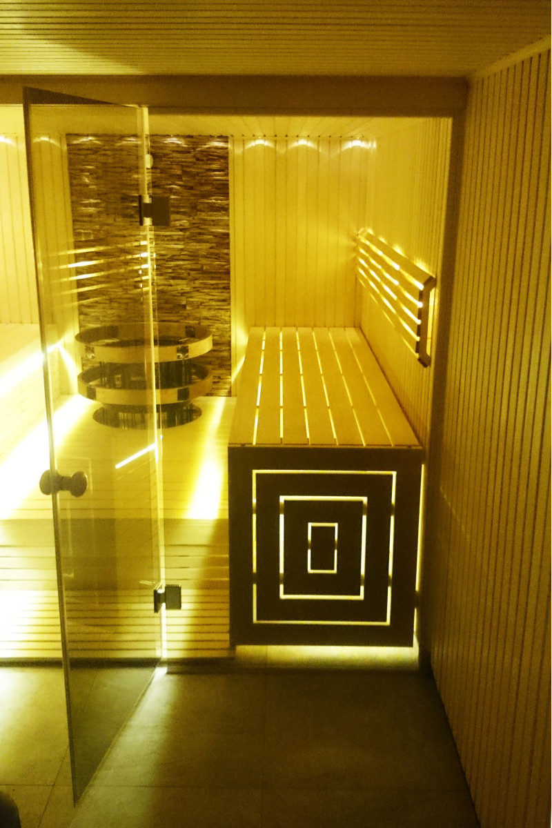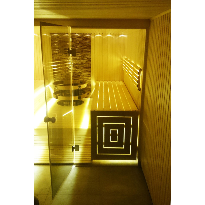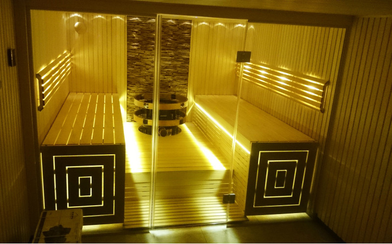 Brüsszelben van egy szauna, amely kitűnik dizájnjával és műszaki megoldásaival. Egyedi, helytakarékos projektet kínáltak mind a kis szaunához, mind a fürdőhelyiségekhez. A szauna nyugágyak egy pódiumra vannak felszerelve, egymással szemben, remek kommunikációs légkört teremtve. A tűzhely a padlóba van beépítve védőgyűrűkkel. A dekoratív téglafal exkluzív akcentus, hangulatos, eredeti környezetet teremt. Az üvegbemutató optikailag megnöveli a teret, és kiegészíti a szauna ultramodern stílusát.
