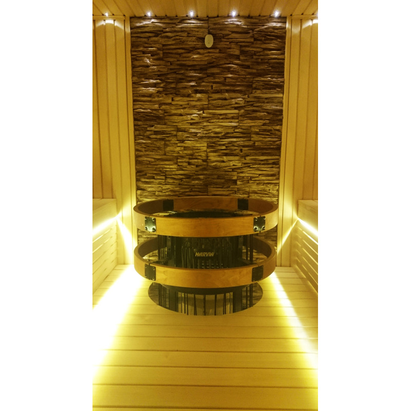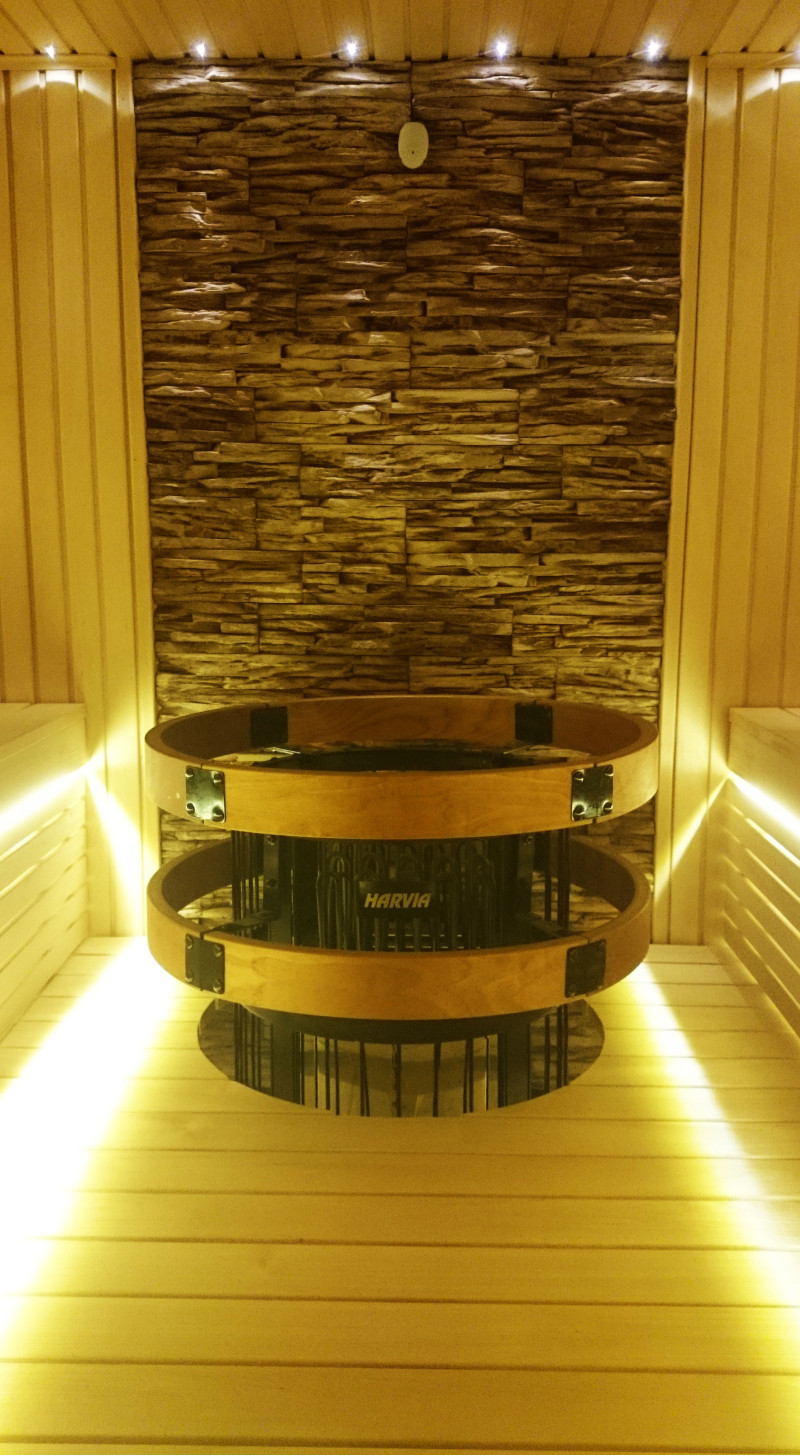 Fűtő - Harvia Legend, amely sok gőzt ad. Nagy mennyiségű olivin-diabáz kövekkel töltve meg. A fűtőtestet egy digitális Griffin konzol vezérli, amely a hőmérsékletet egy pontossággal állíthatja be.