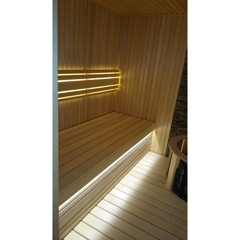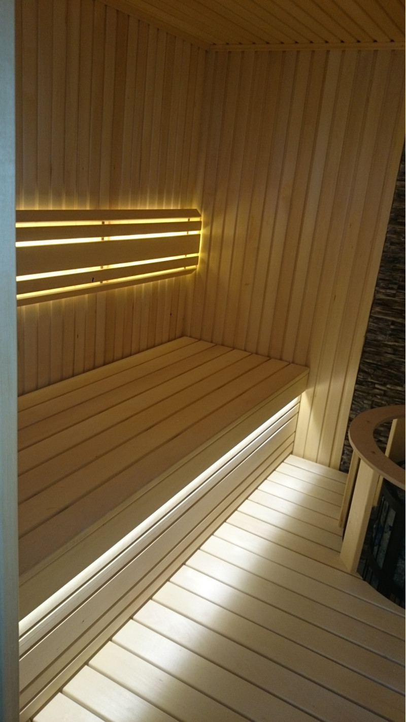 A világítás teremti meg a legnagyobb otthonosságot a szaunában. Ebben az esetben a háttámlákba és a padok alá melegfehér LED-es világítás kerül beépítésre.