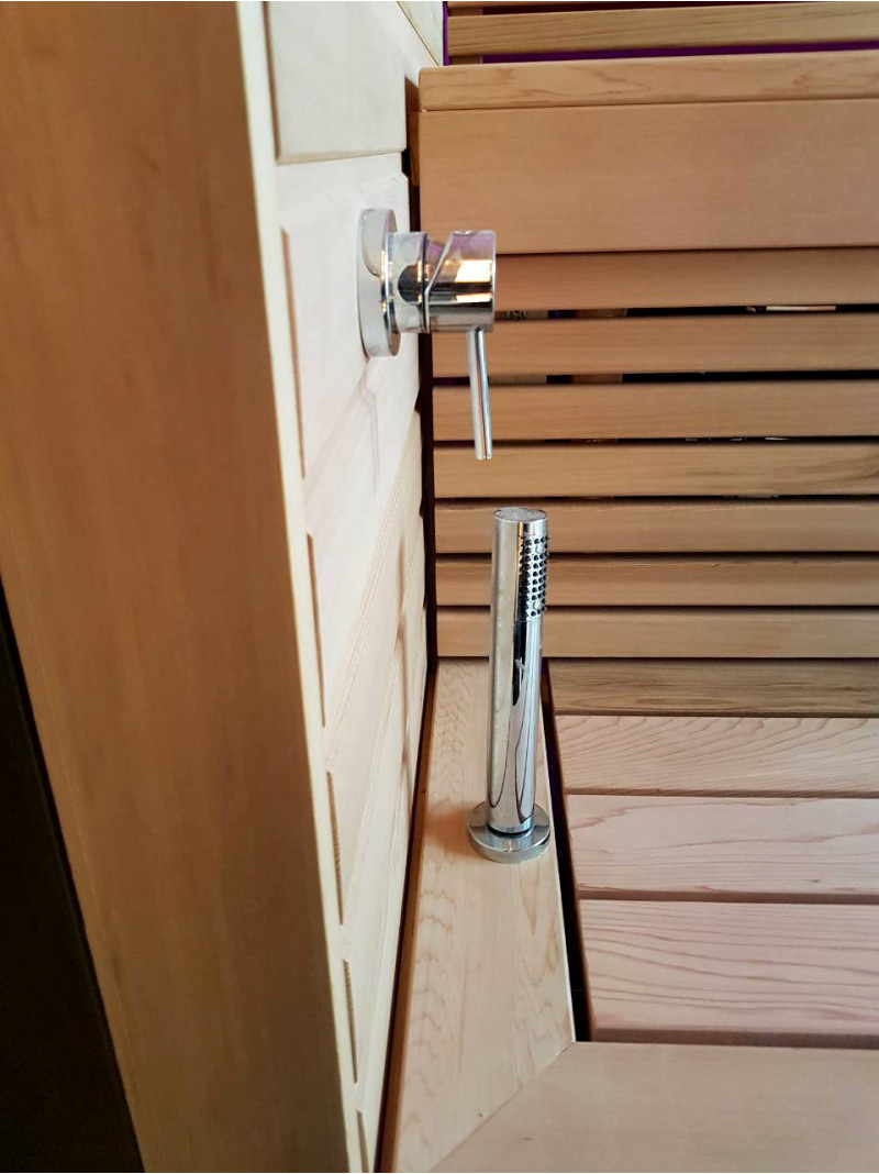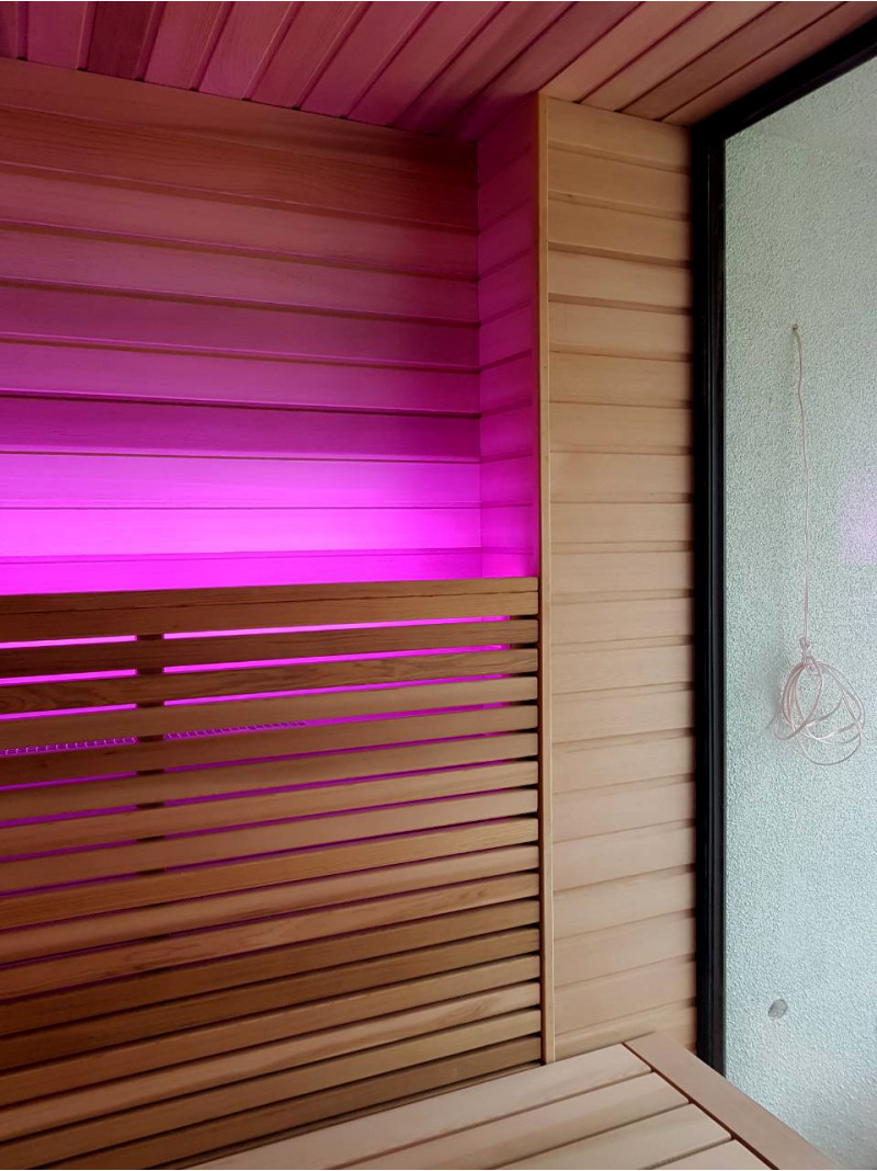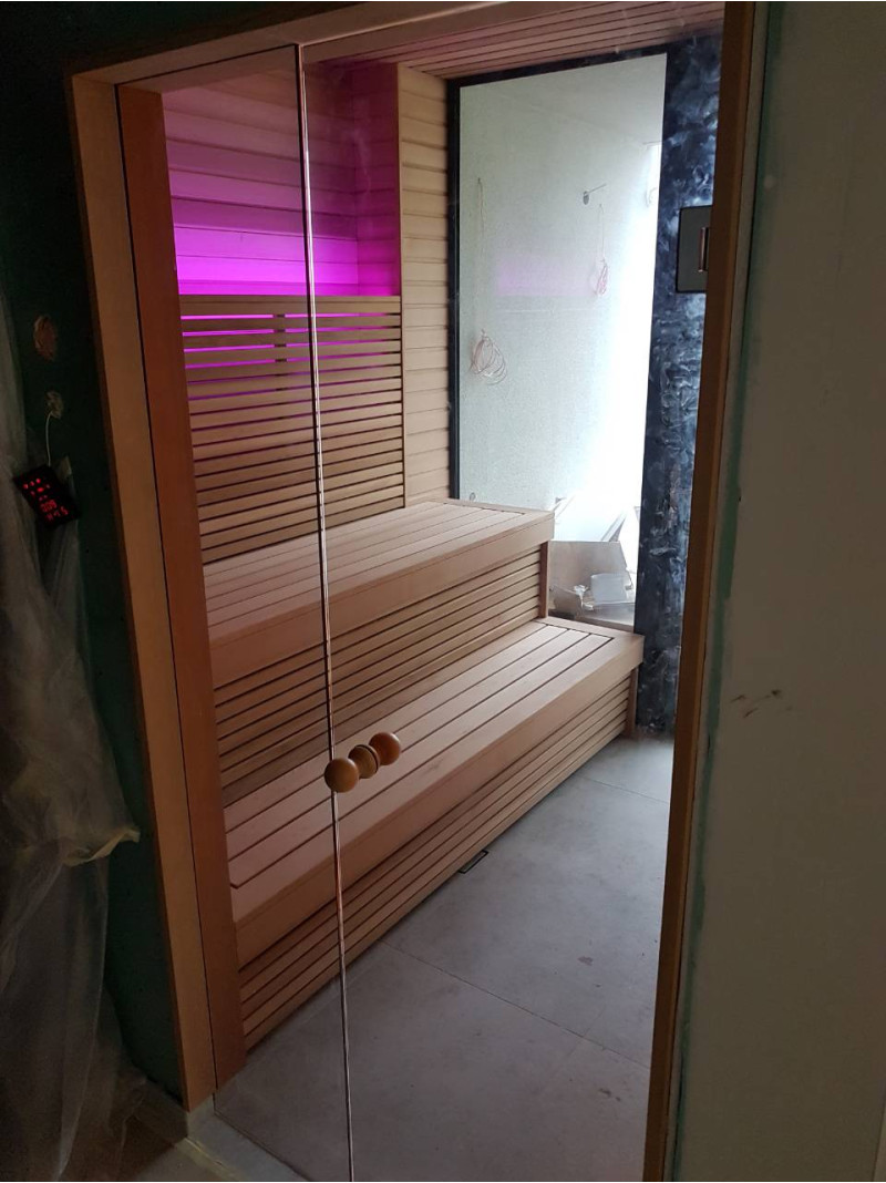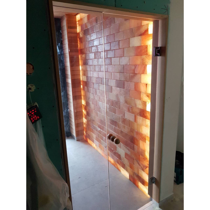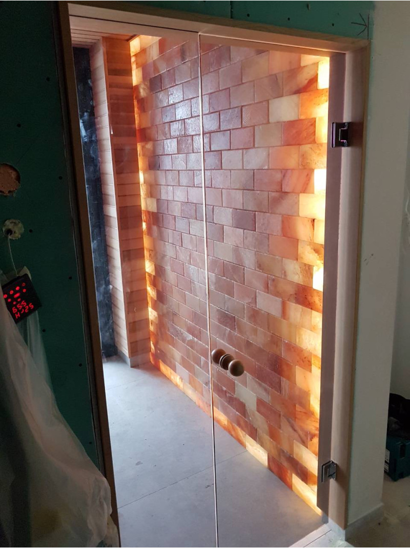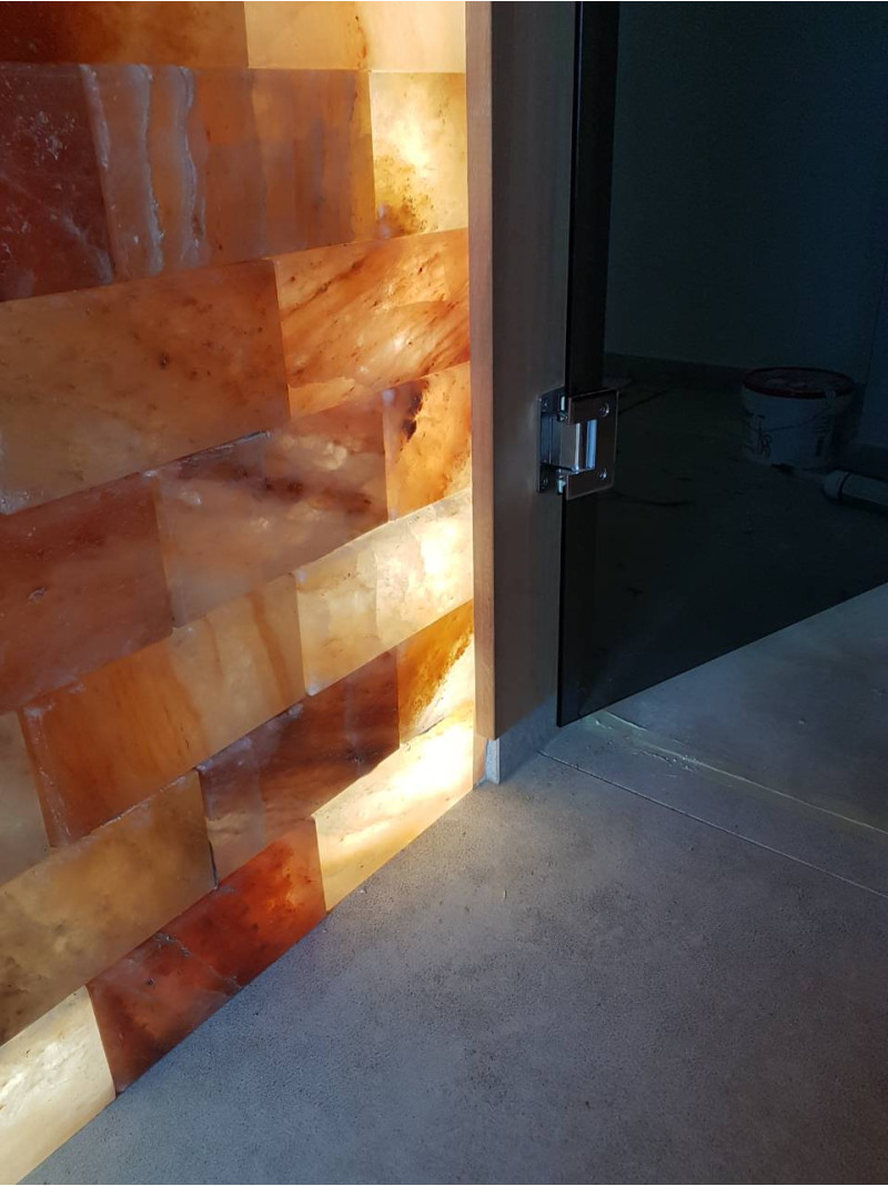 A szauna egyedi megjelenésű himalájai sótömbök falával van felszerelve. Ezt a képet tovább erősíti a sótömbök alá beépített fehér meleg világítás, amely kiemeli a só színét és mintáit. A himalájai sót nem csak szépsége miatt használják a szaunában, de állítólag a himalájai só csökkenti az allergia és az asztma tüneteit, javítja a hangulatot és energiát ad, semlegesíti az elektromágneses sugárzást, csökkenti a levegő statikus elektromosságát.