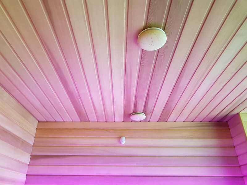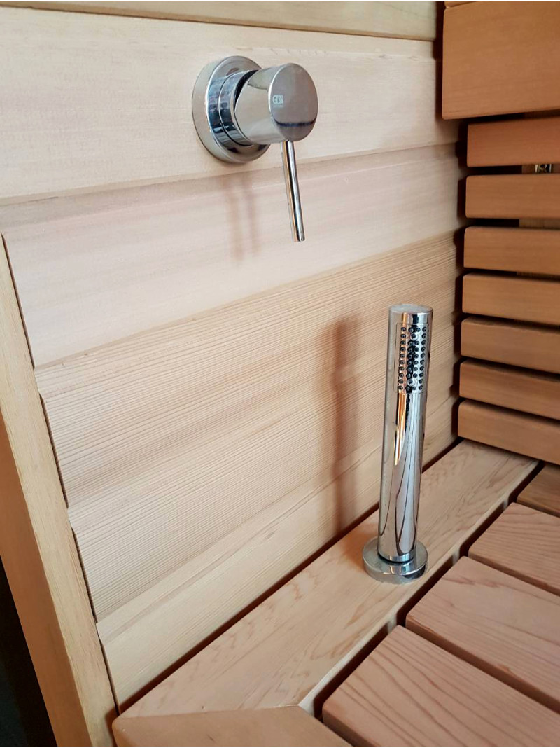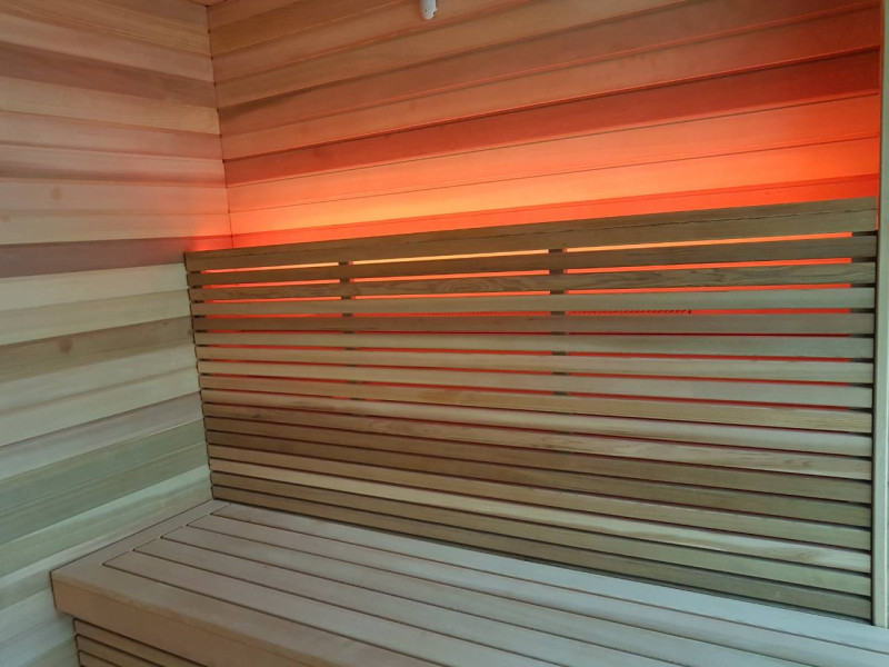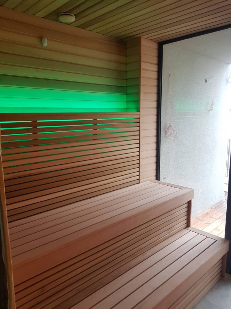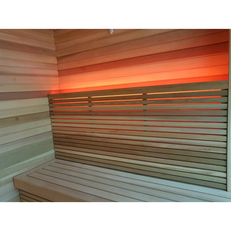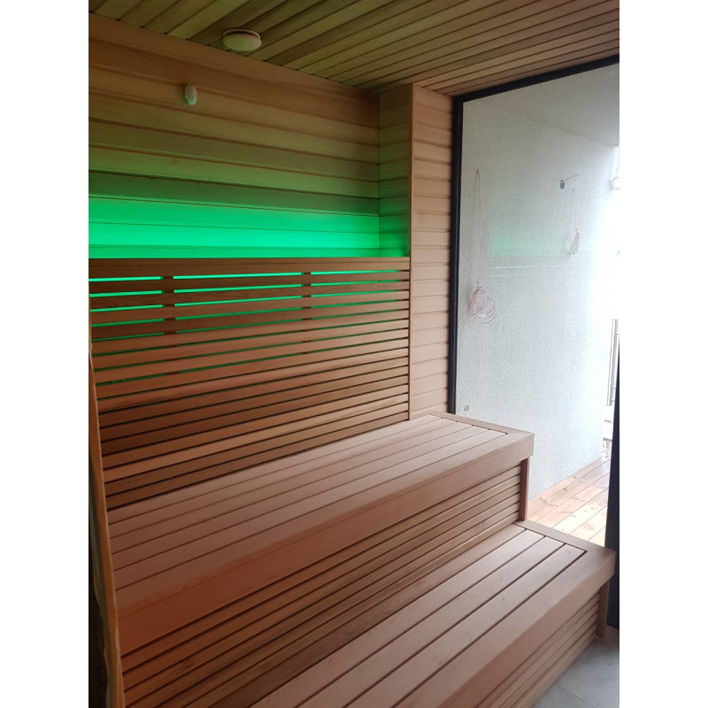 A szauna belső fa részletei cédrusfából készültek. Ez a fa rendkívül tartós, kopásálló és nem deformálódik. Magas hőmérsékleten a cédrus iparvágány nem bocsát ki gyantát. Nagyon jól visszaveri a hőt, ami szaunában, fürdőben elengedhetetlen. A cédrusfa illóolajokat bocsát ki és a természetes aromaterápia hatását hozza létre.