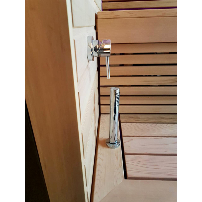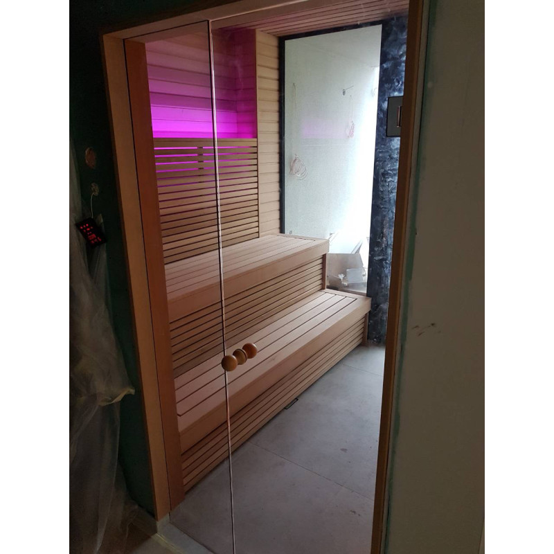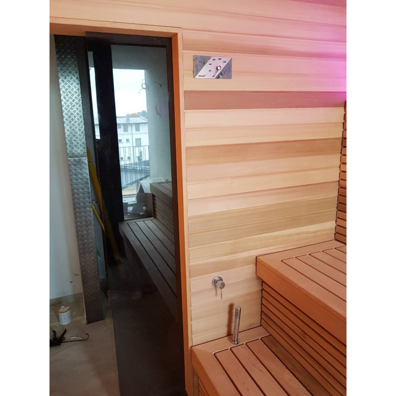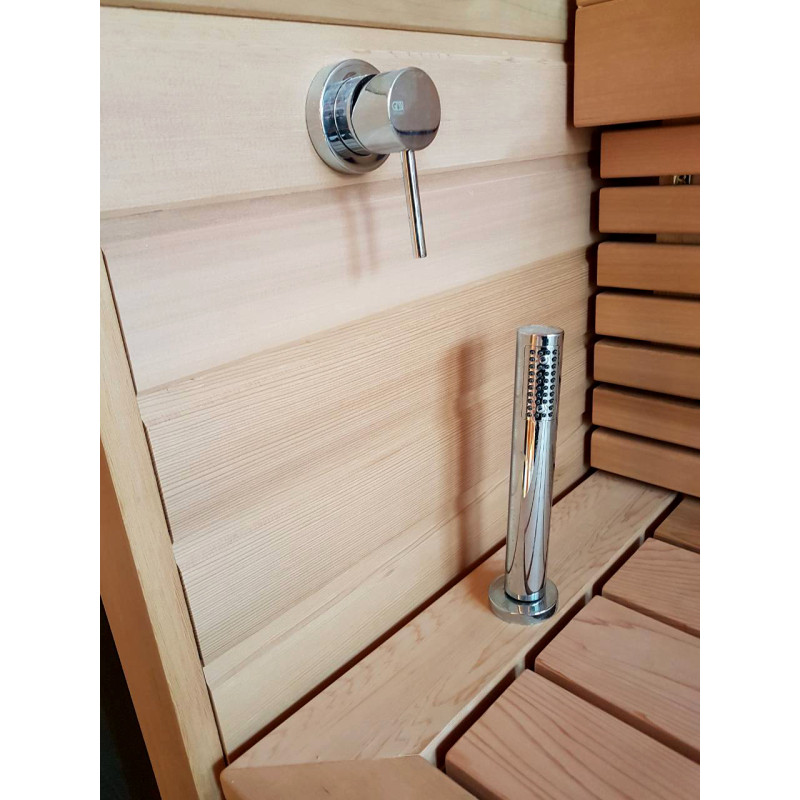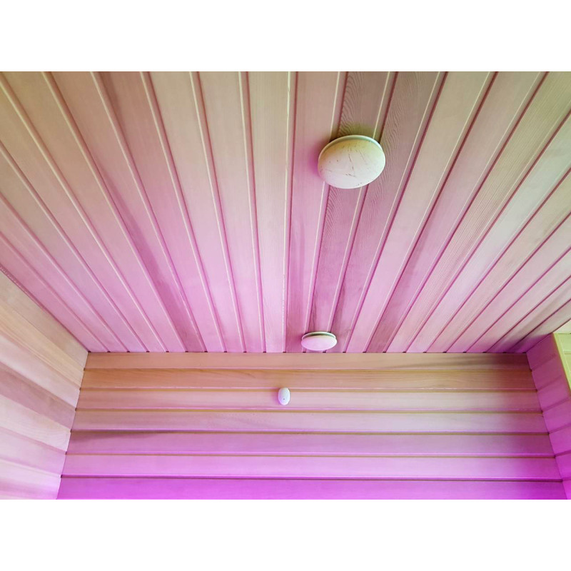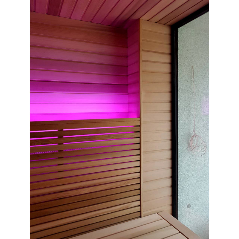 A szauna belső fa részletei cédrusfából készültek. Ez a fa rendkívül tartós, kopásálló és nem deformálódik. Magas hőmérsékleten a cédrus iparvágány nem bocsát ki gyantát. Nagyon jól visszaveri a hőt, ami szaunában, fürdőben elengedhetetlen. A cédrusfa illóolajokat bocsát ki és a természetes aromaterápia hatását hozza létre.