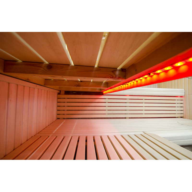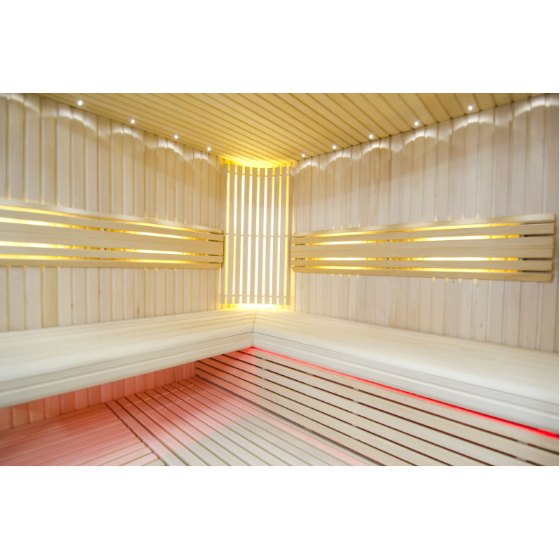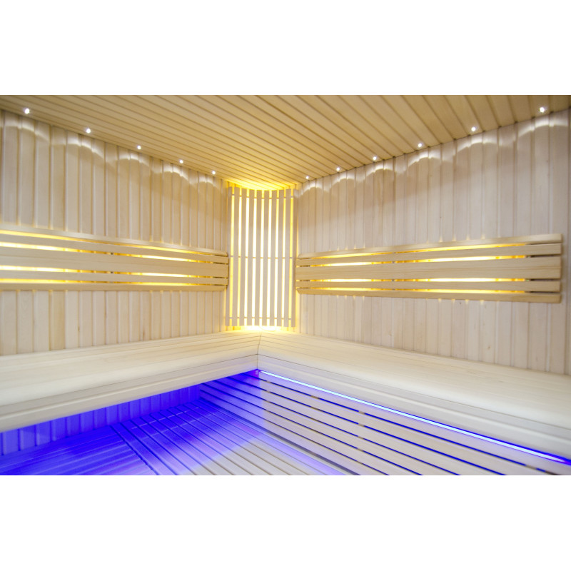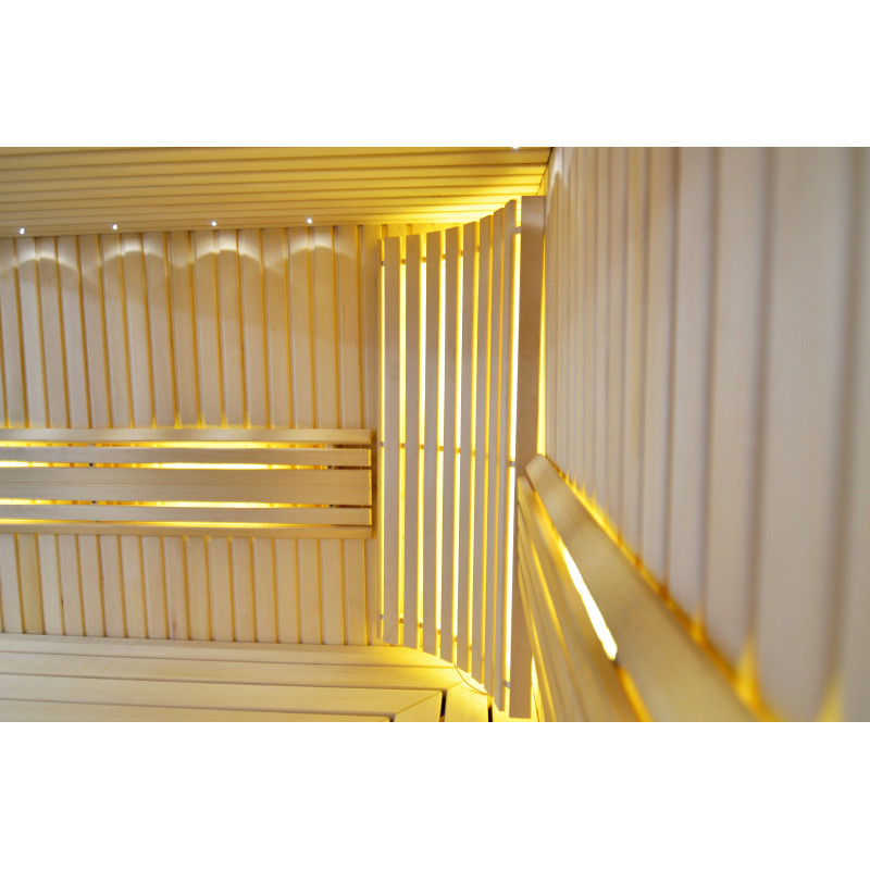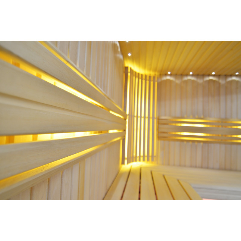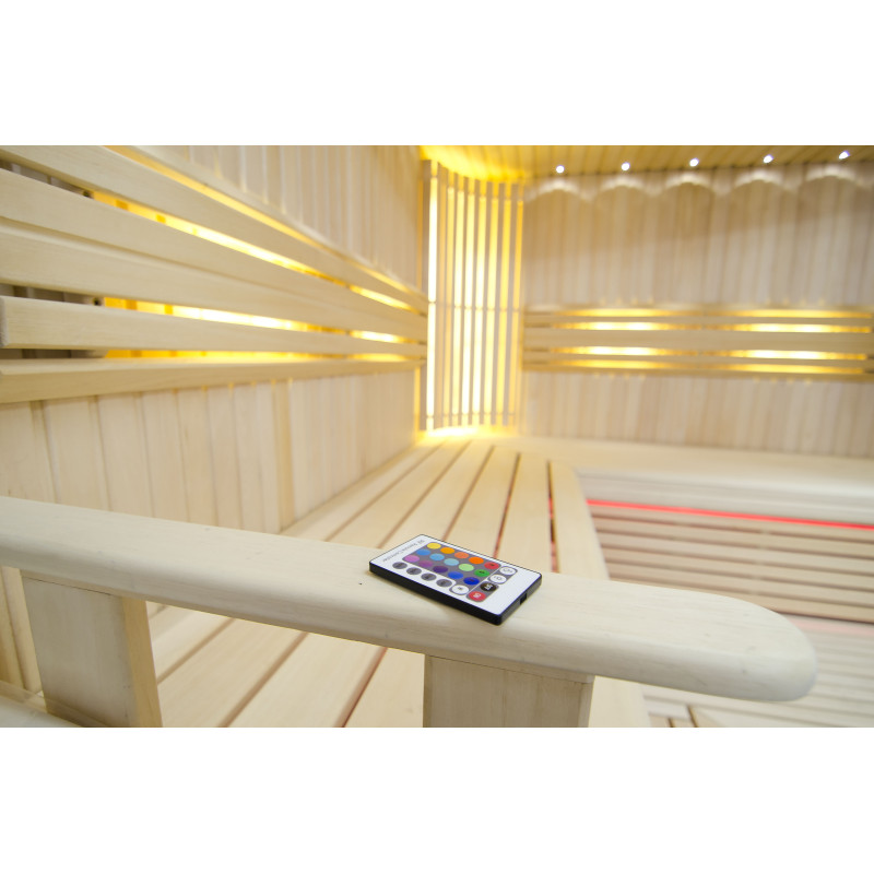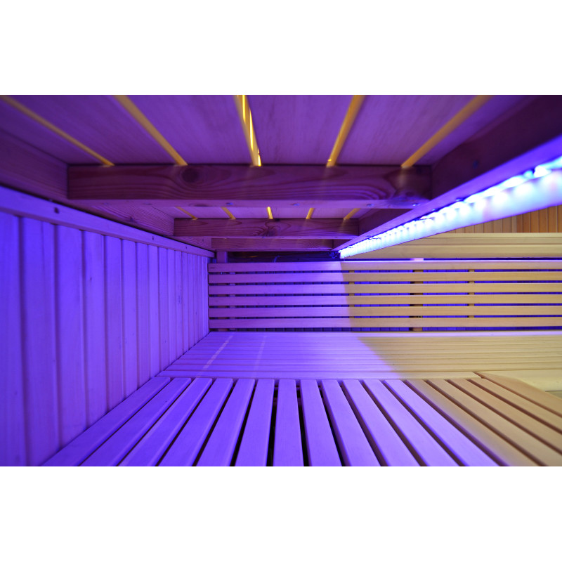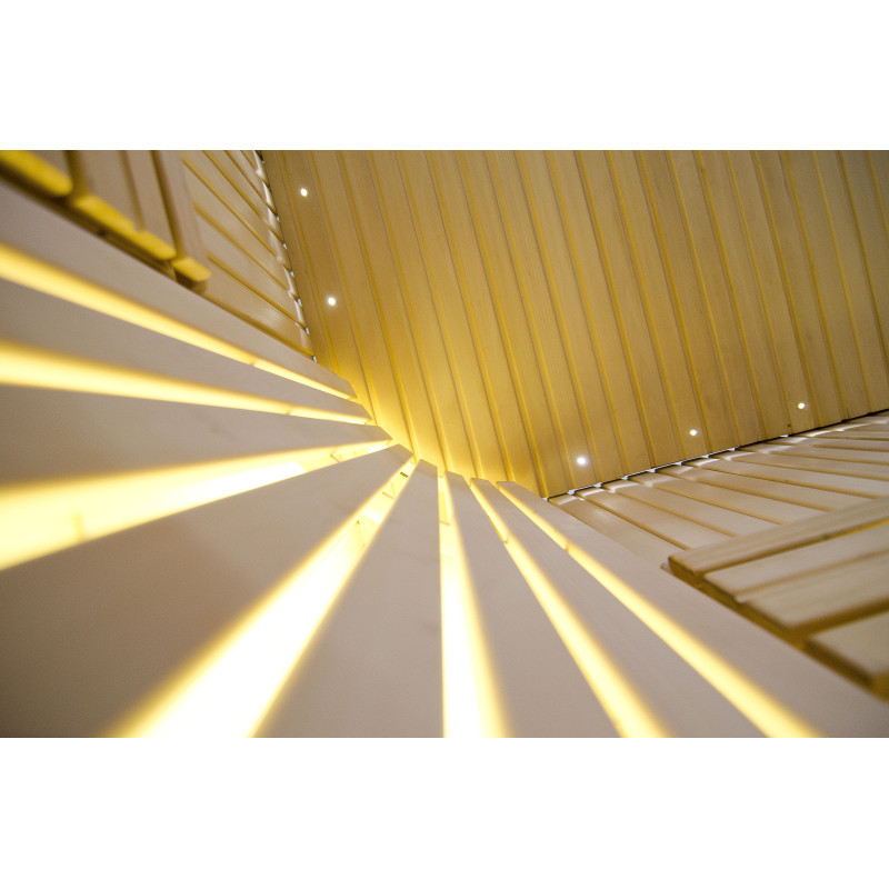 A mennyezetet fehér LED-es "hold" világítás világítja meg - ez egy jó alternatíva a száloptikás világításhoz. A falakon a háttámlák alatt - LED fehér meleg világítás, amely tökéletesen kiemeli a fa textúráját. A padok alatt - LED RGB színes világítás, melynek színeit a távirányítóval egyszerűen szabályozhatod a szauna kívánt hangulatának megteremtéséhez.