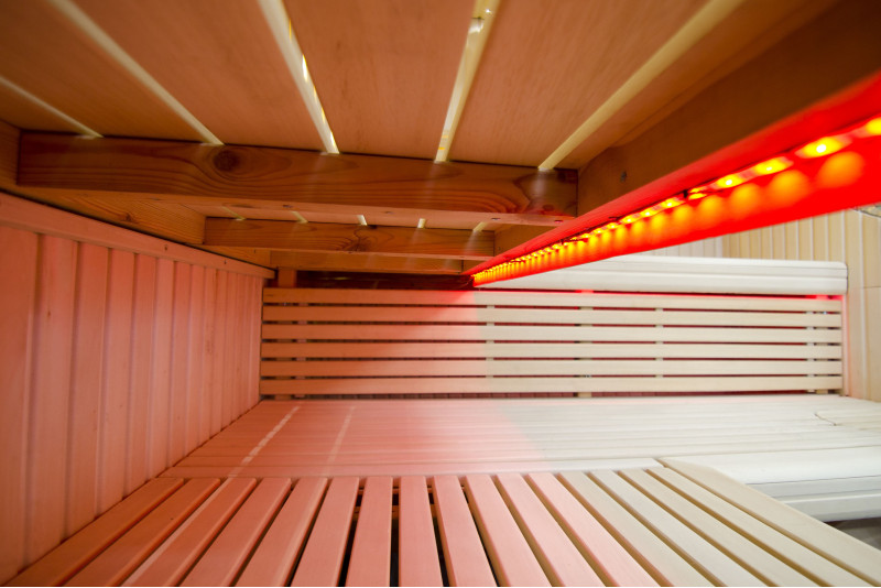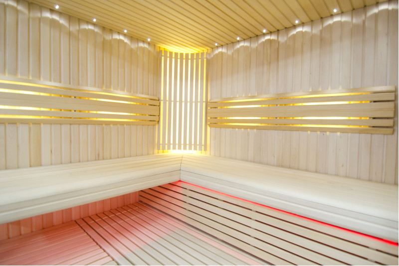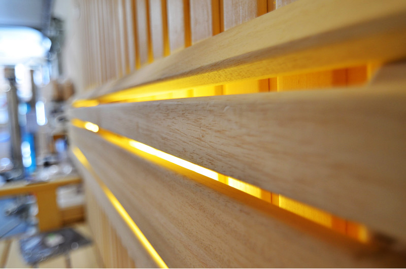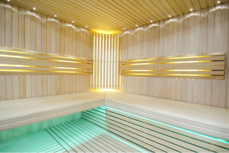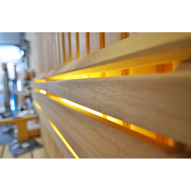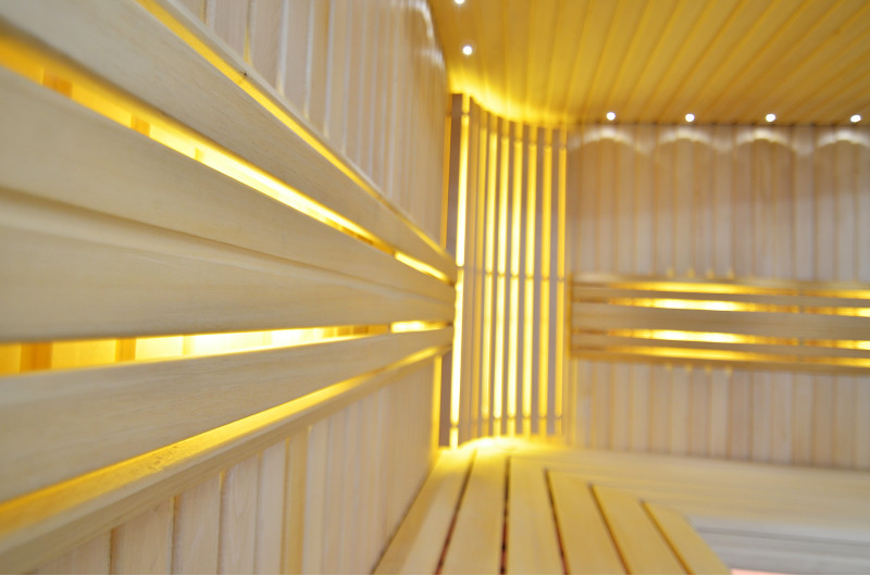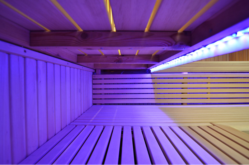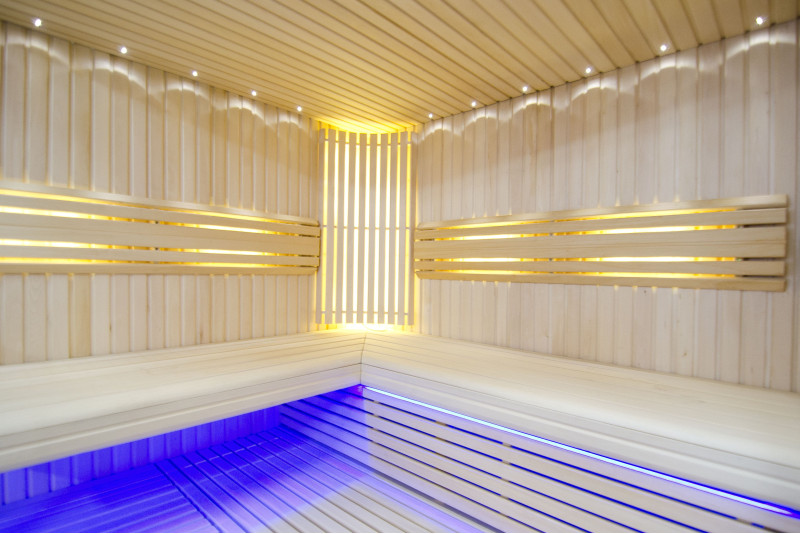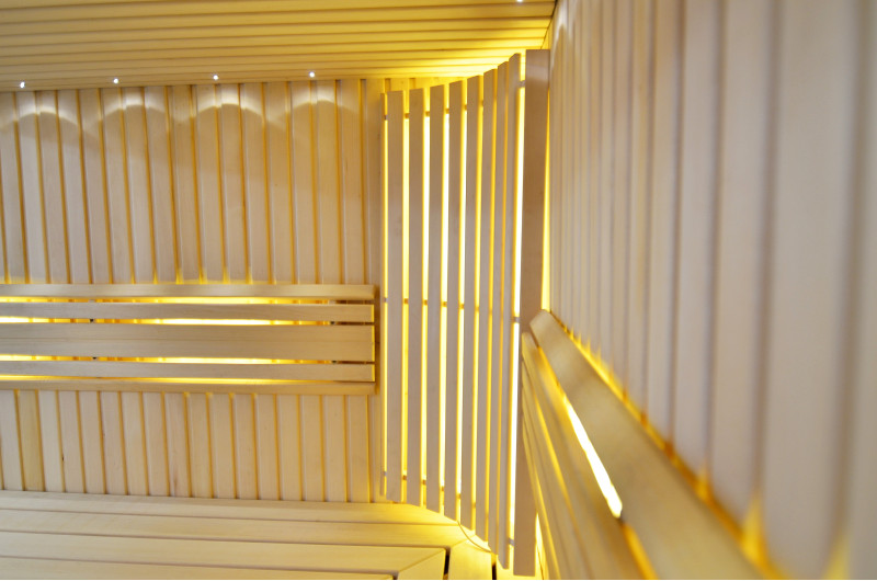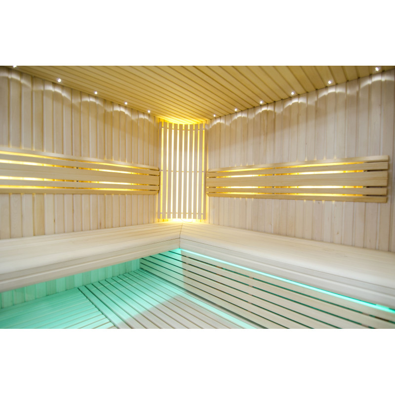 A mennyezetet fehér LED-es "hold" világítás világítja meg - ez egy jó alternatíva a száloptikás világításhoz. A falakon a háttámlák alatt - LED fehér meleg világítás, amely tökéletesen kiemeli a fa textúráját. A padok alatt - LED RGB színes világítás, melynek színeit a távirányítóval egyszerűen szabályozhatod a szauna kívánt hangulatának megteremtéséhez.