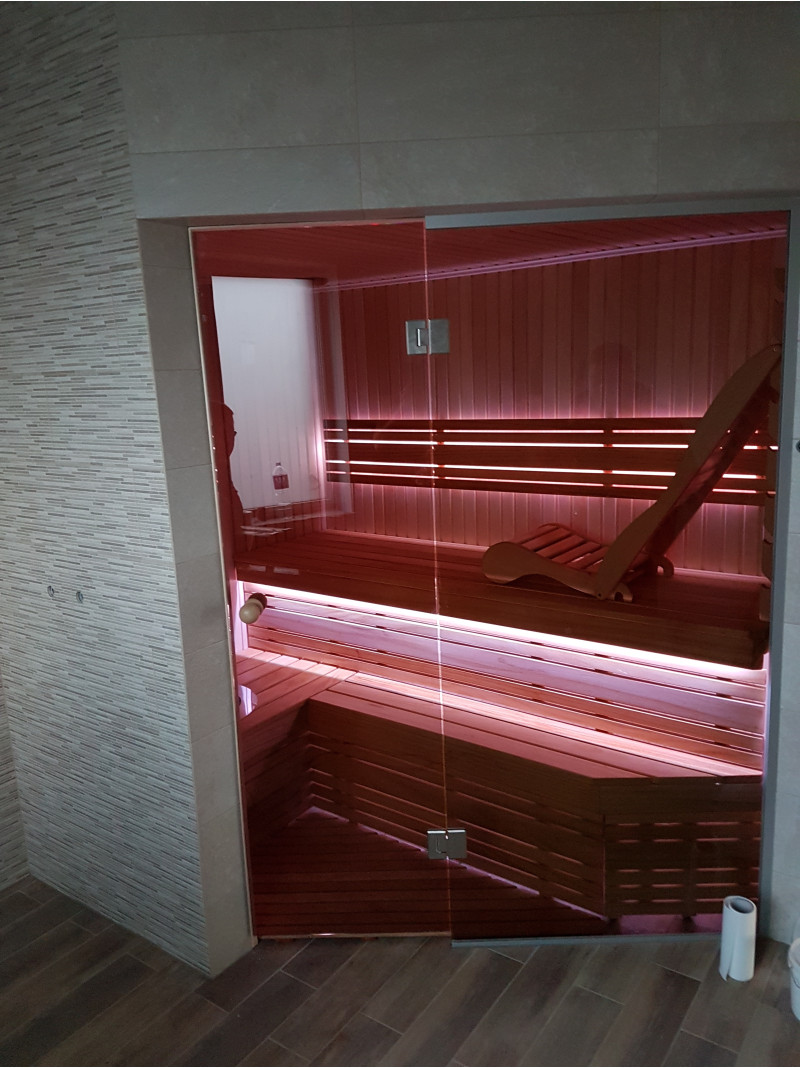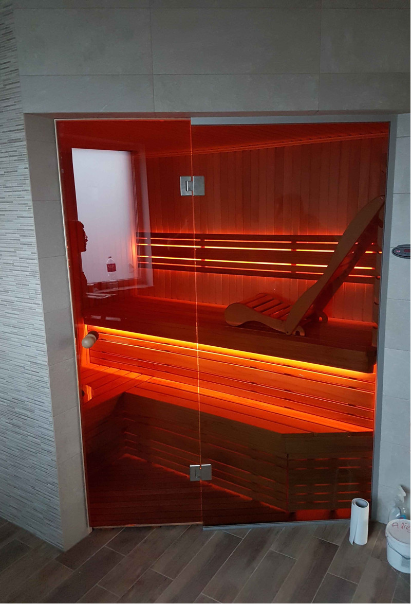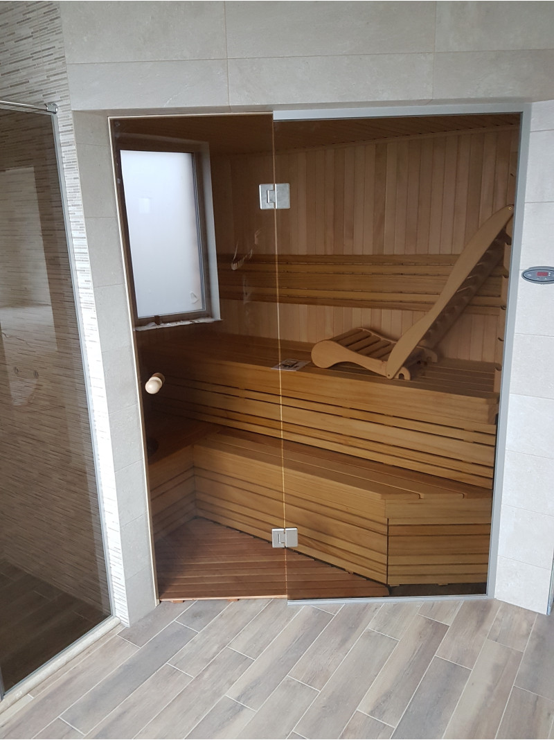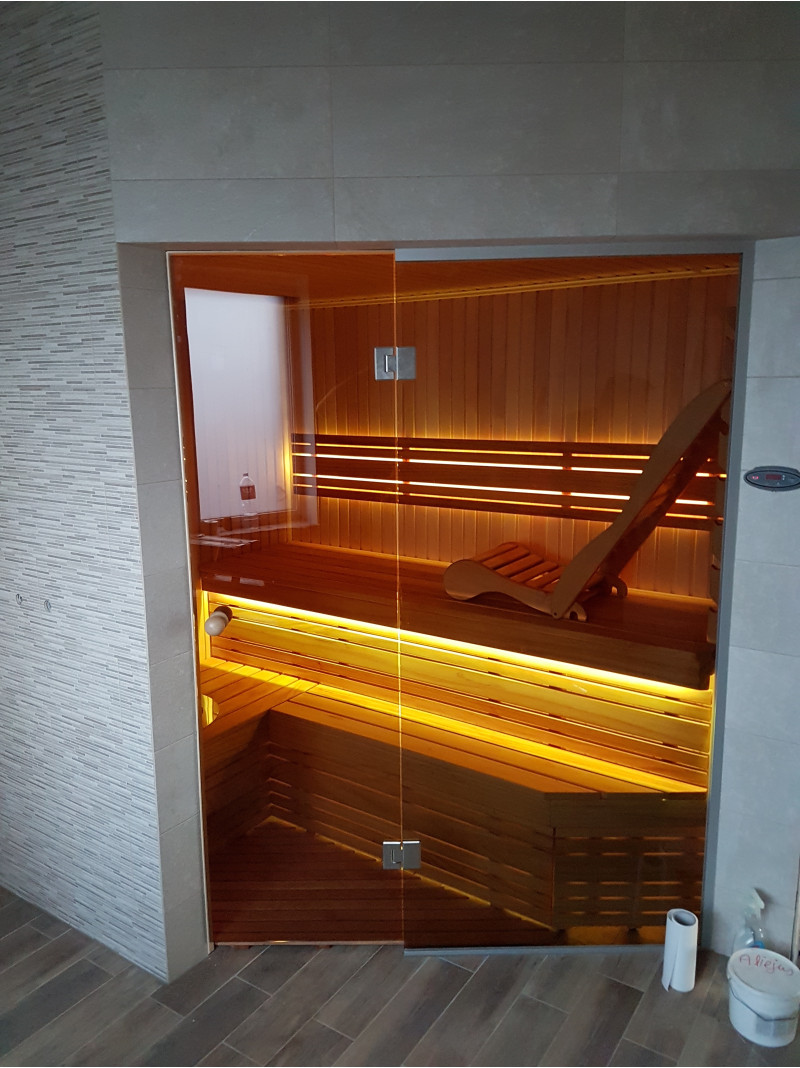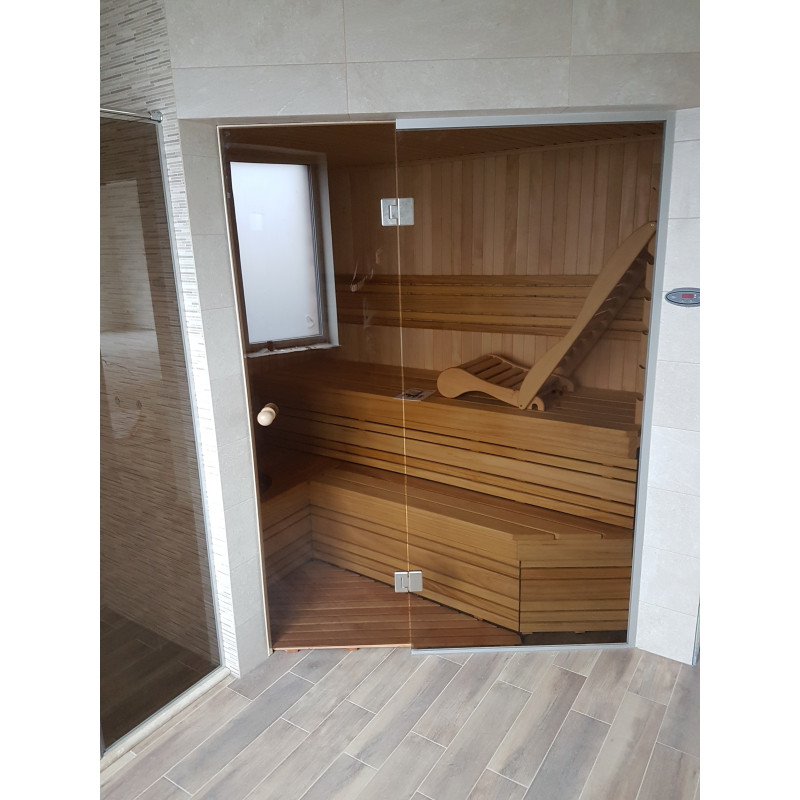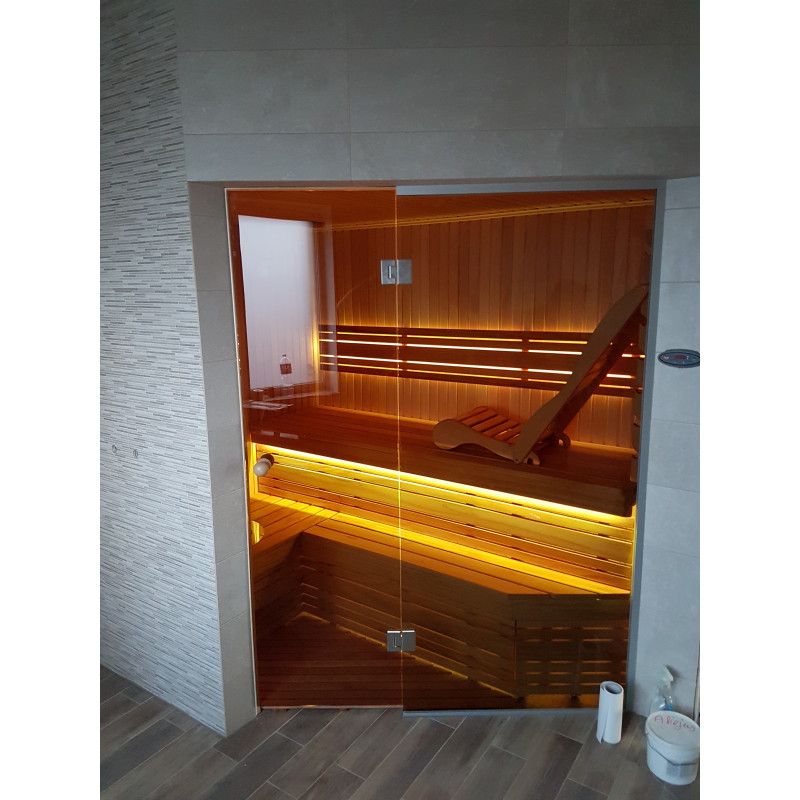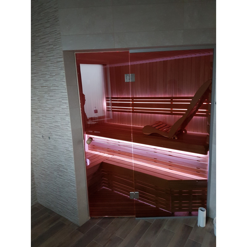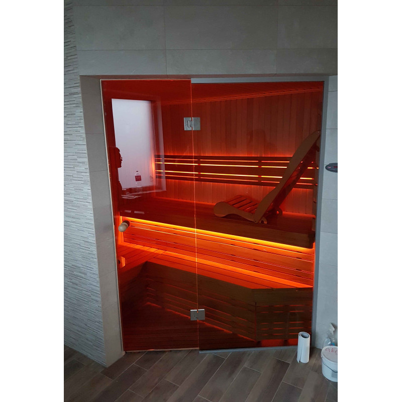 A szaunaajtó edzett, bronz, 8 mm-es, alumínium keretes üvegvitrin, mely ellenáll a hőnek és a páratartalomnak, a hőmérséklet-ingadozásnak.