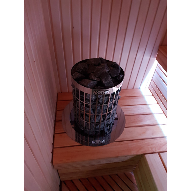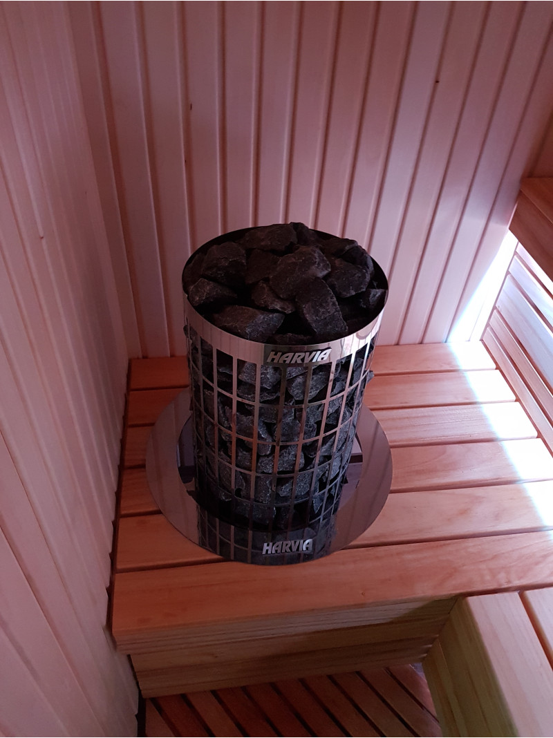 Modern kialakítású kályha - Harvia Cilindro rozsdamentes acél díszgyűrűvel, a szauna nyugágyakba integrálva. Nagy mennyiségű követ tart, sok könnyű gőzt termel.