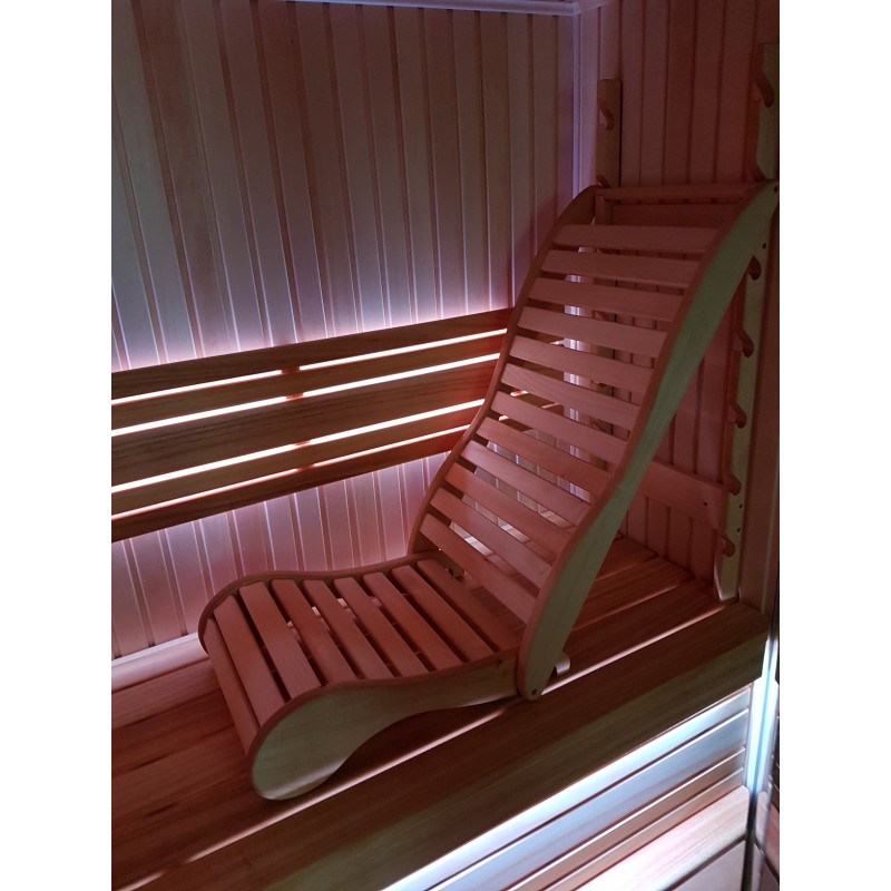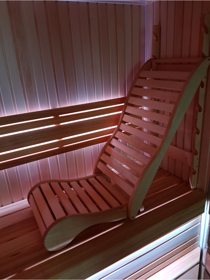 A felső szaunaágyon egy lazító, kézzel készített pad található a kényelmesebb ültetés és pihenés érdekében a szaunában. Kiválasztható a legkényelmesebb pozíció, mivel ennek a pihentető szaunapadnak a magassága és helyzete állítható. Az elegáns dizájn extra otthonosságot kölcsönöz a szauna helyiségnek.