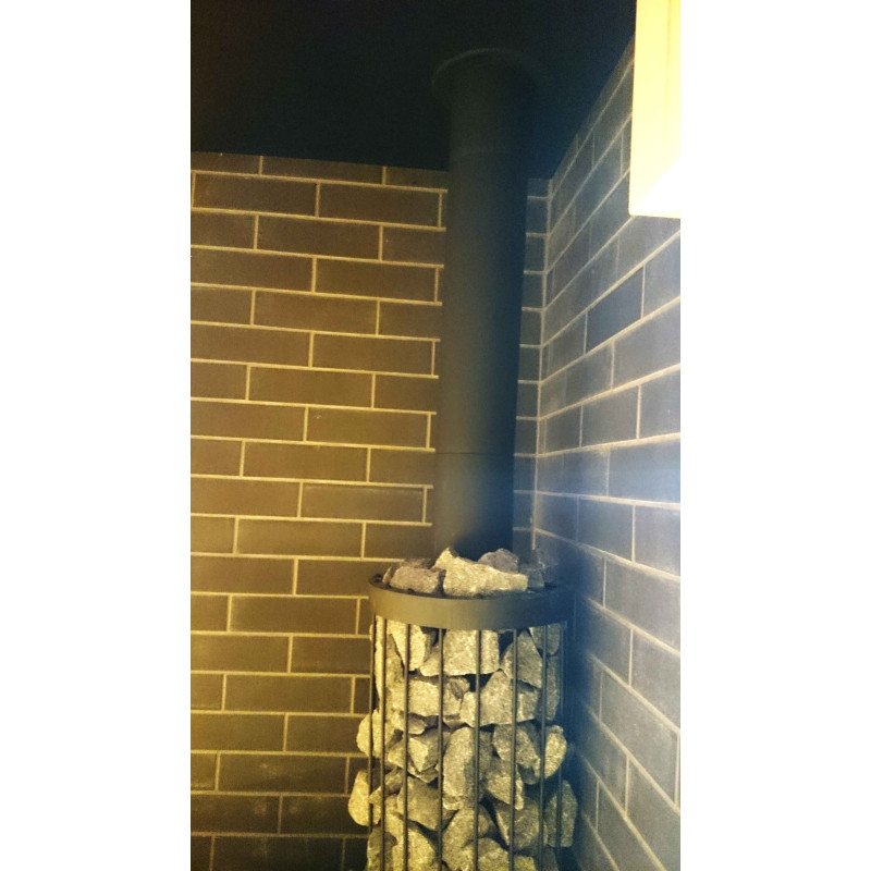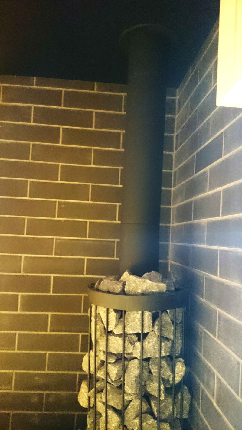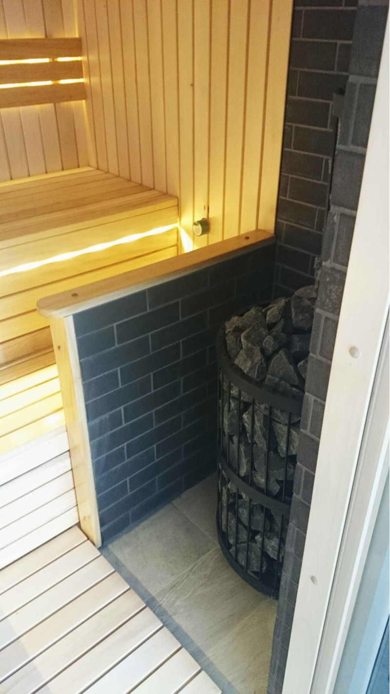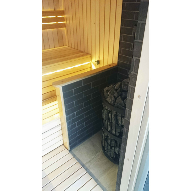 Ez a szauna projekt védőfallal a kályha számára. A fal Minerit hőálló lemezből készült, fémvázon.