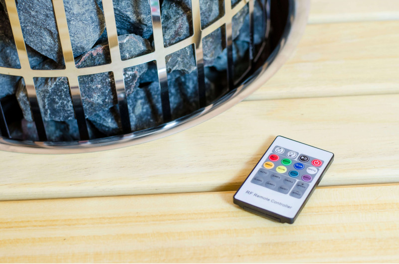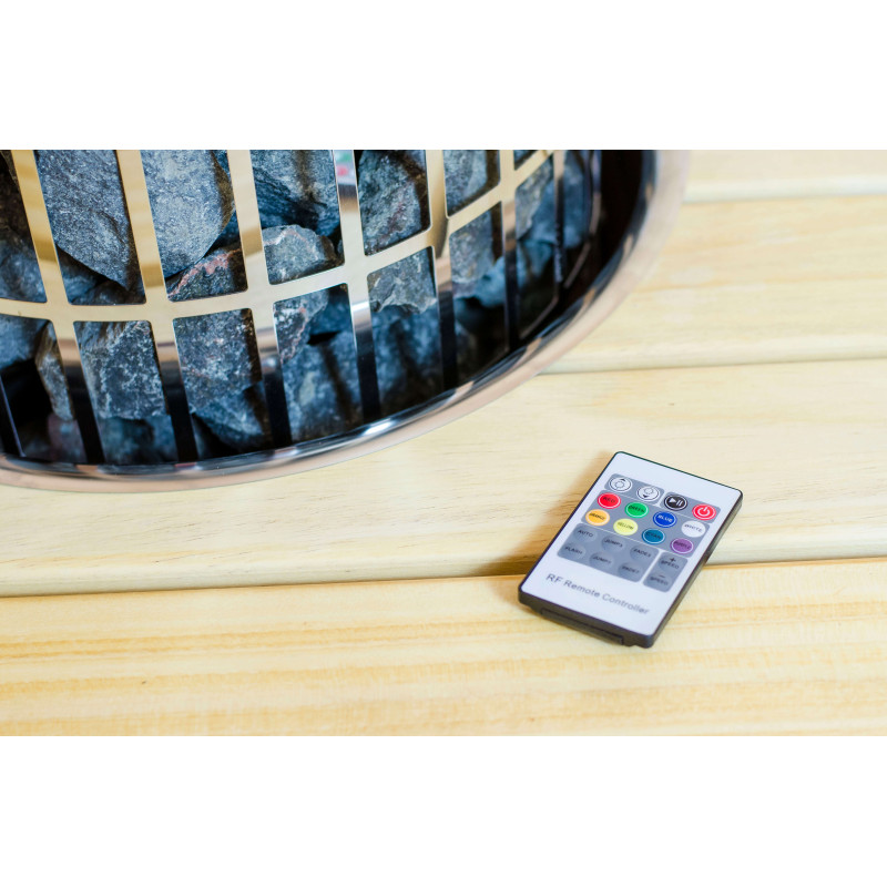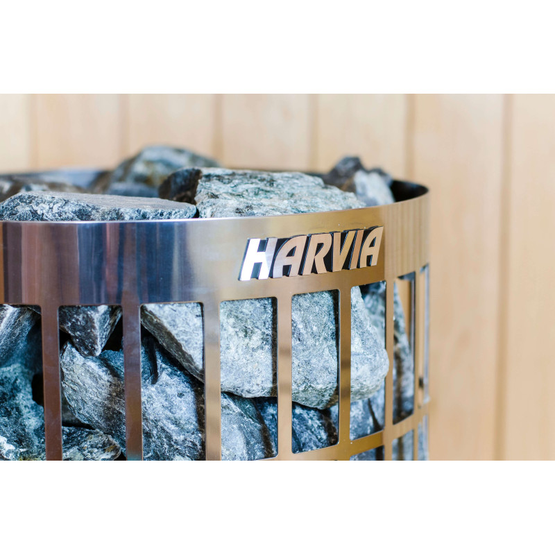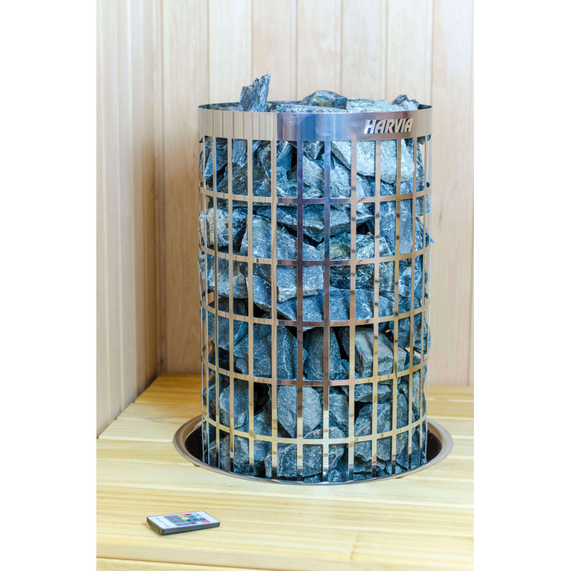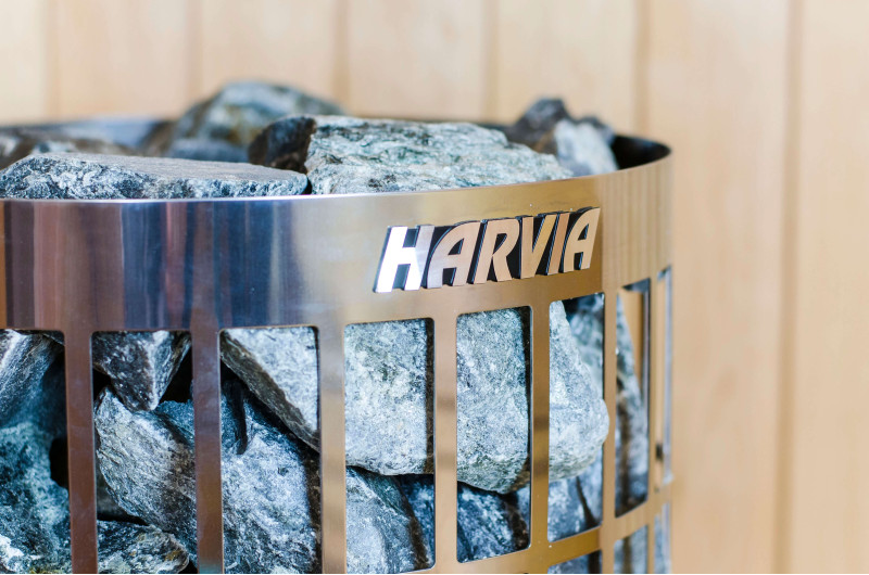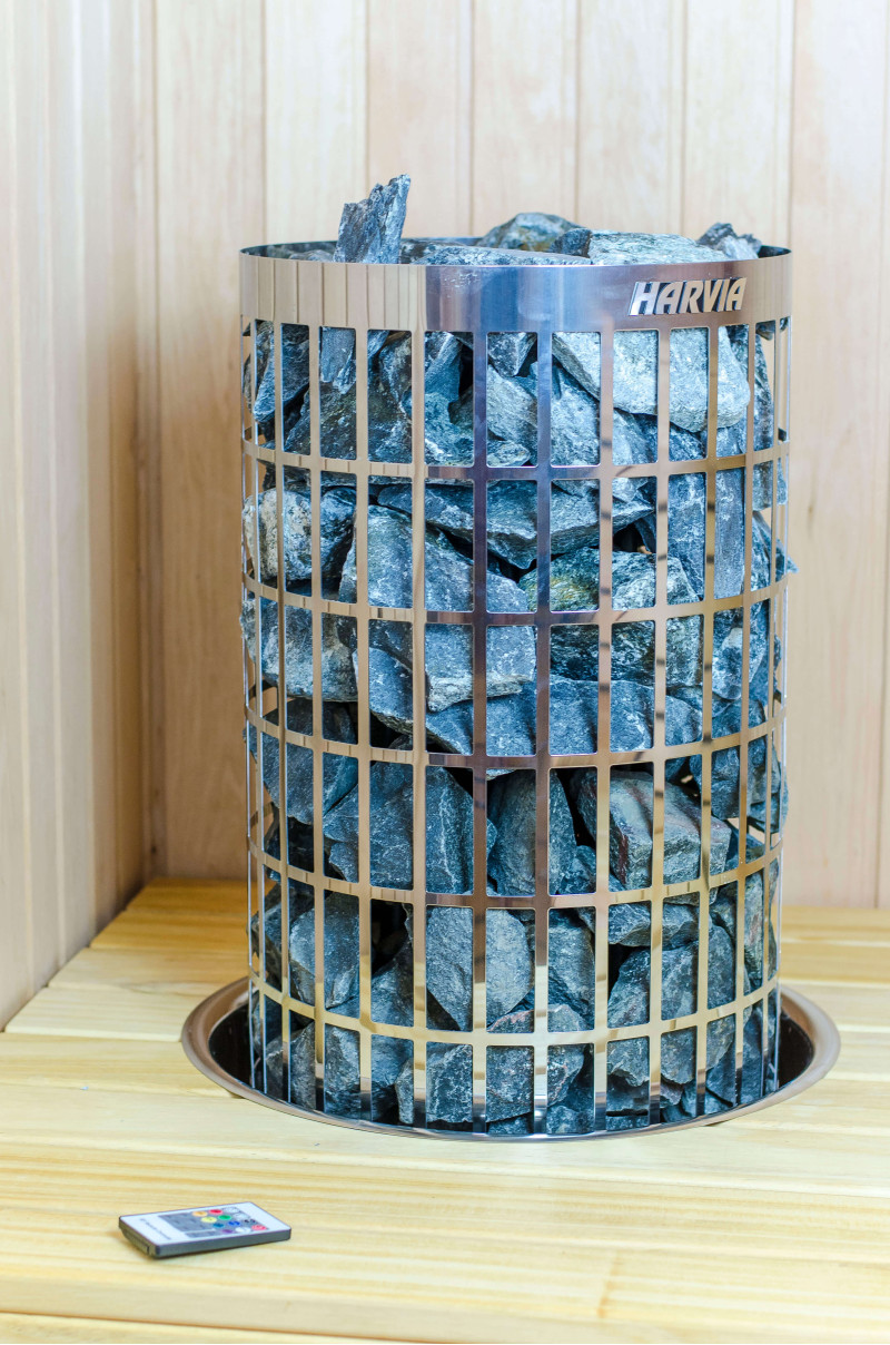 Fűtő - Harvia Cilindro befejező gyűrűvel és gabbro diabáz kövekkel töltve. Ajtók - edzett bronz üveg, fekete éger kerettel.
