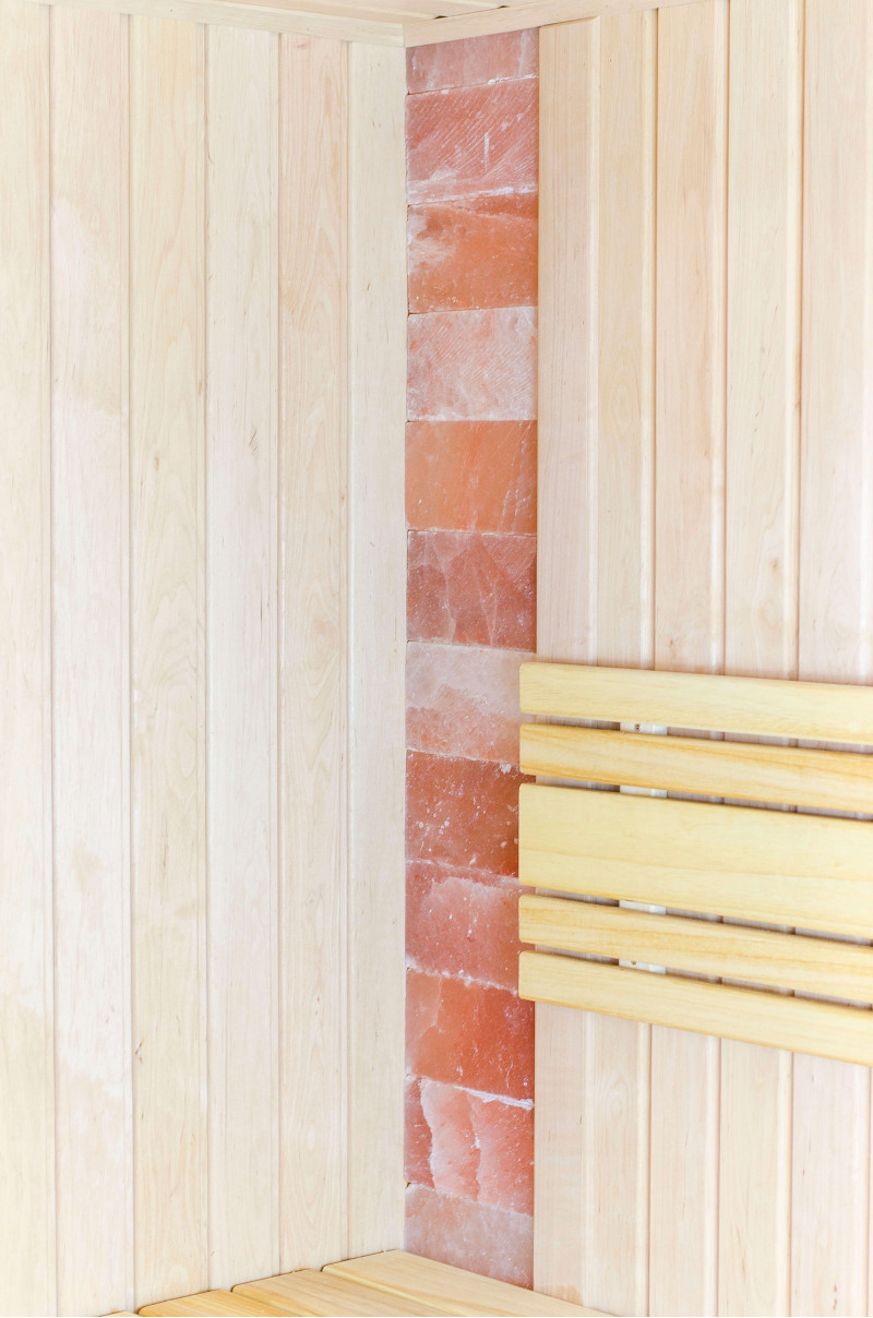 A szauna díszítésére kiválasztott himalájai sótéglák beépített világítással hangulatos környezetet teremtenek és tovább fokozzák a szauna hatását. A himalájai sókövek természetes ionizátorok, amelyek hatékonyan javítják a levegő minőségét negatív ionok kibocsátásával. A negatívan ionizált levegő javítja az egészséget, segít számos betegség kezelésében, például: hörgő asztma, tüdő- és hörgőbetegségek, posztinfarktus, magas vérnyomás, gyomor-bélrendszeri fekélyek, gyomorhurut, pajzsmirigybetegségek, dermatitis, különféle allergiák, idegbetegségek, segít legyőzni a stroke-ot. Az ilyen szaunában végzett eljárások előnyei kettősek.