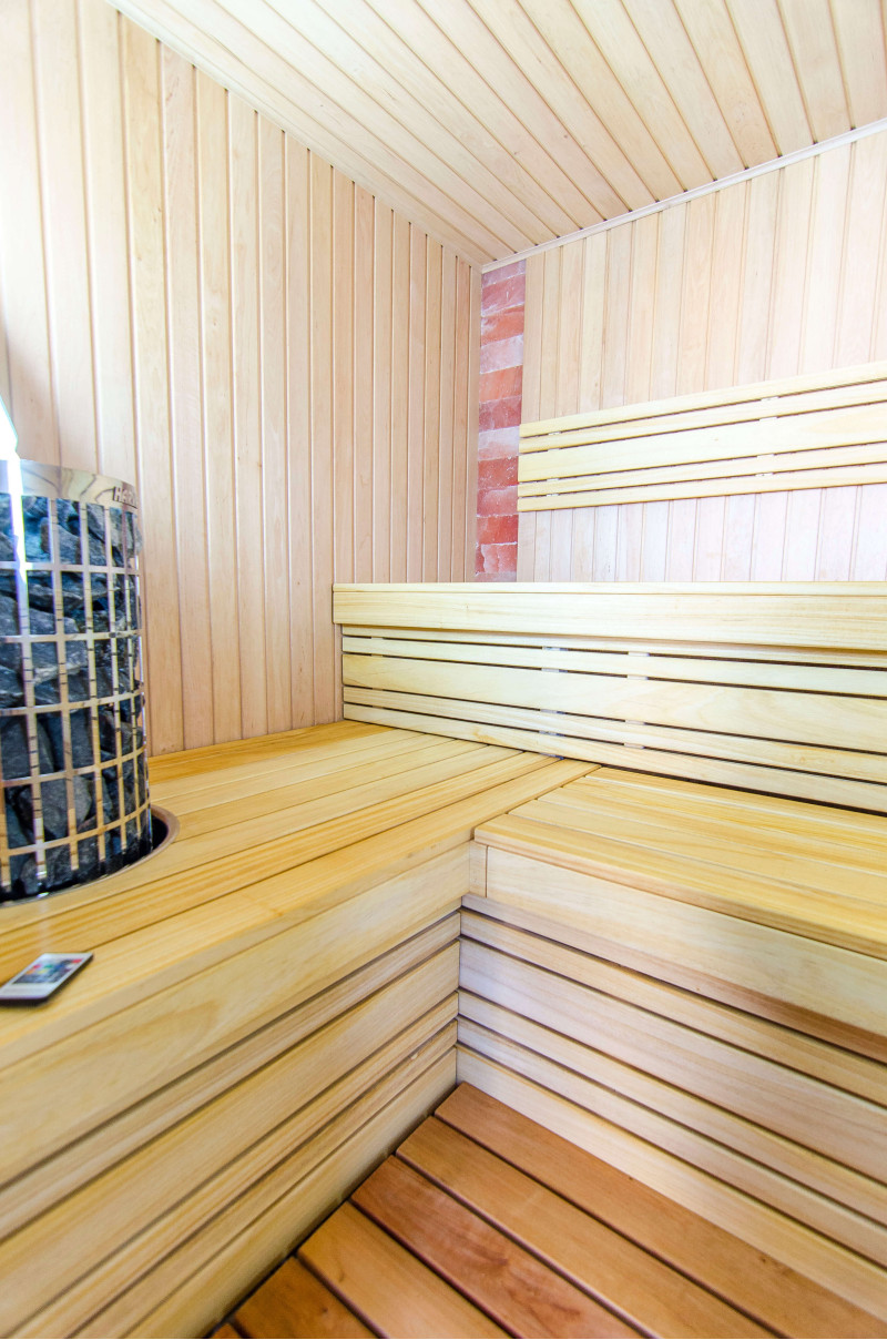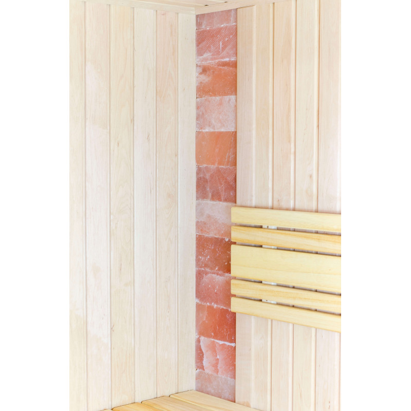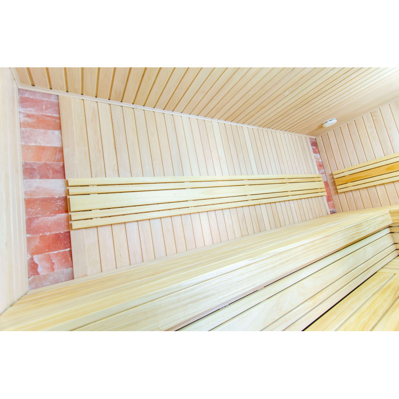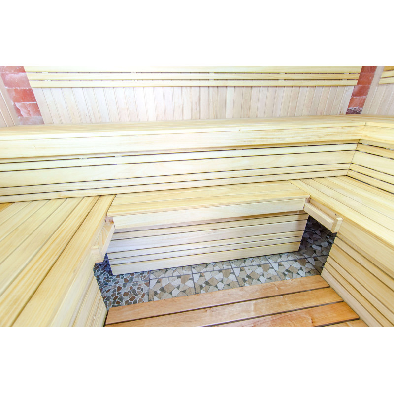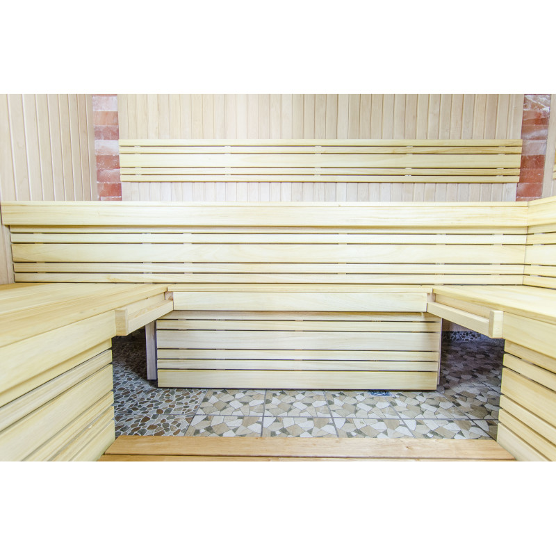 Padok, háttámlák, mennyezetek, falak - afrikai nem fűthető minőségi abachi fából, padlórácsok - fekete égerfából. A háttámlák és a himalájai sótéglák mögött beépített színes RGB világítás található, amelyet vezeték nélküli színváltó konzol vezérel, amely kiemeli a himalájai só jellegzetes megjelenését.