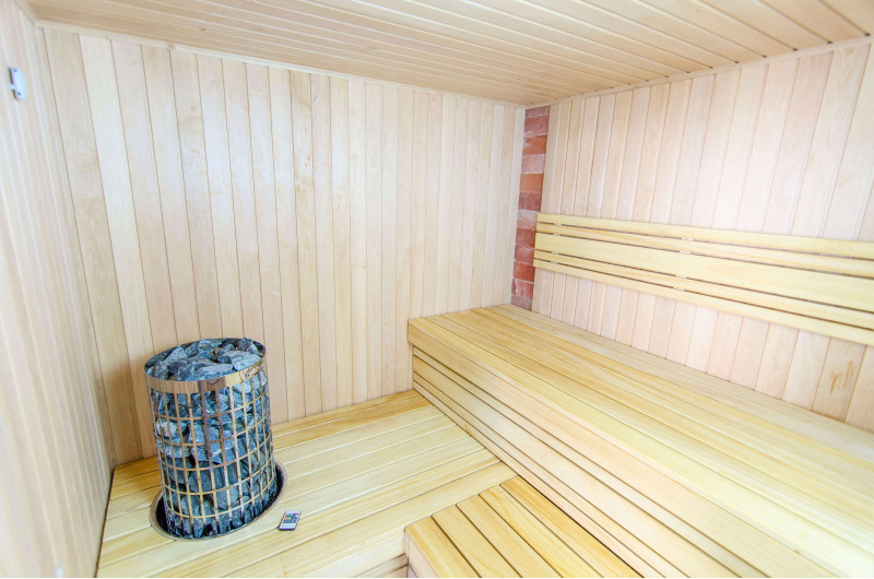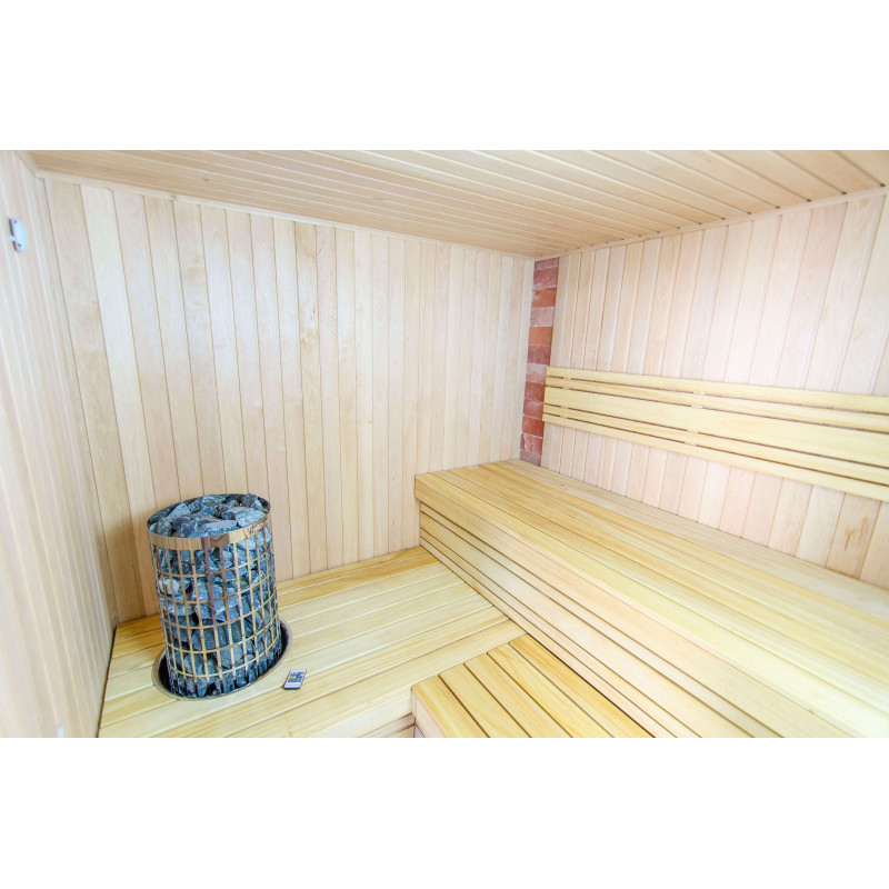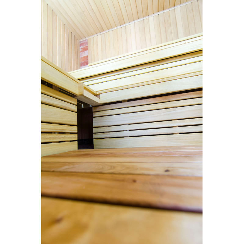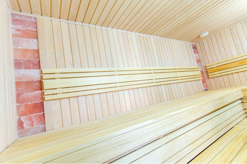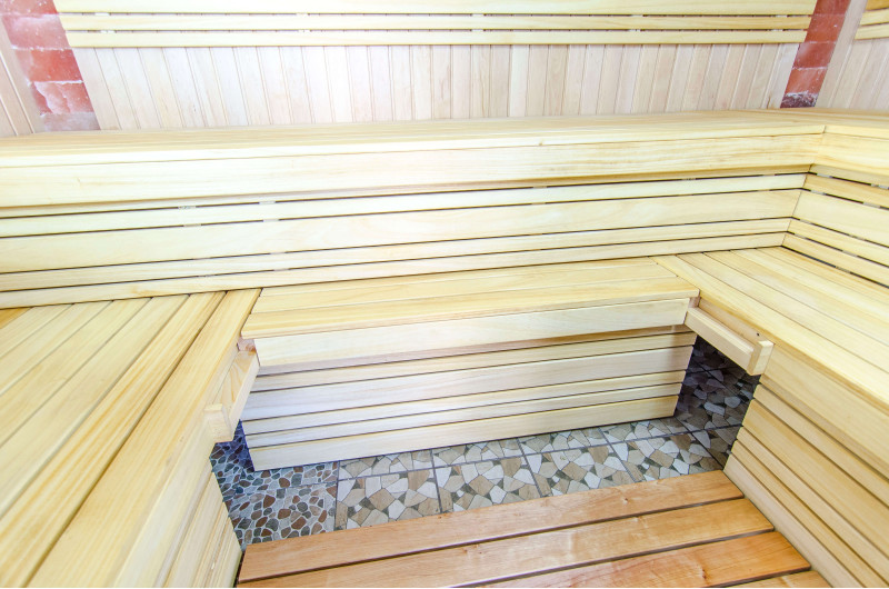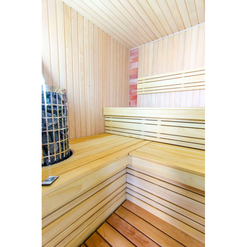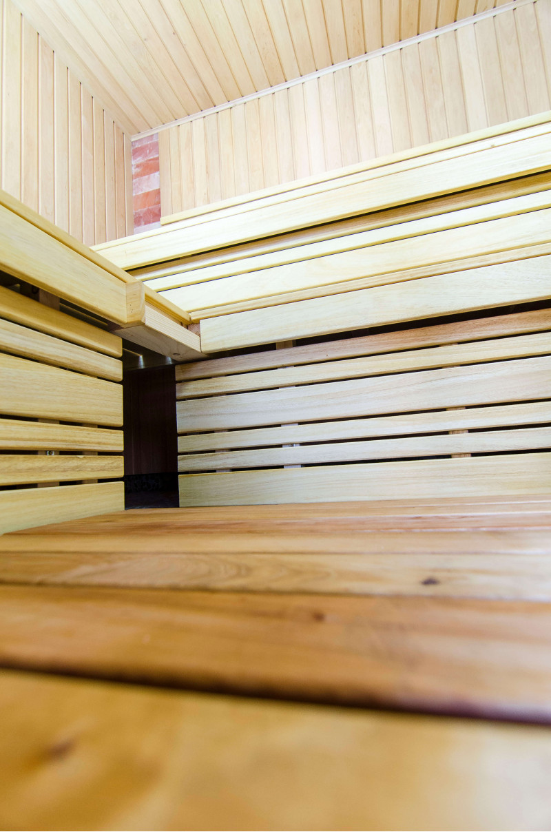 Padok, háttámlák, mennyezetek, falak - afrikai nem fűthető minőségi abachi fából, padlórácsok - fekete égerfából. A háttámlák és a himalájai sótéglák mögött beépített színes RGB világítás található, amelyet vezeték nélküli színváltó konzol vezérel, amely kiemeli a himalájai só jellegzetes megjelenését.