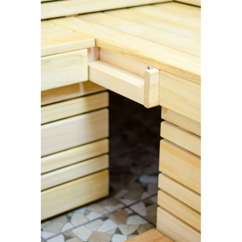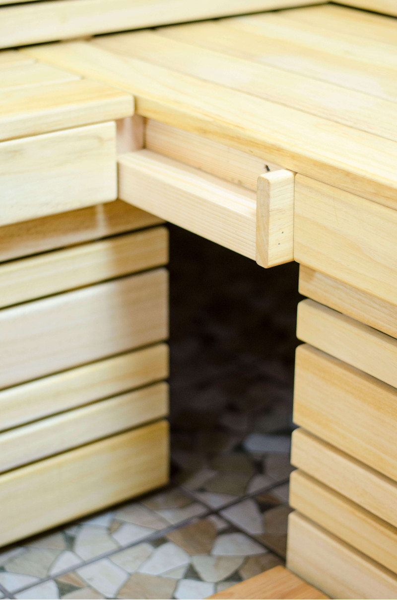 Ennek a szaunának a legnagyobb előnye a csúszó alsó ágy a kényelmes fürdés érdekében. Az ügyfél kérésére a kellően széles és megfelelő magasságú napozóágyakat úgy tervezték, hogy kényelmesen álljanak. Fürdés közben a napozóágy ülősarokká változik. A széles napozóágy sokkal kényelmesebbé teszi a fürdést, mivel melegebb helyre lehet vinni a lábát.