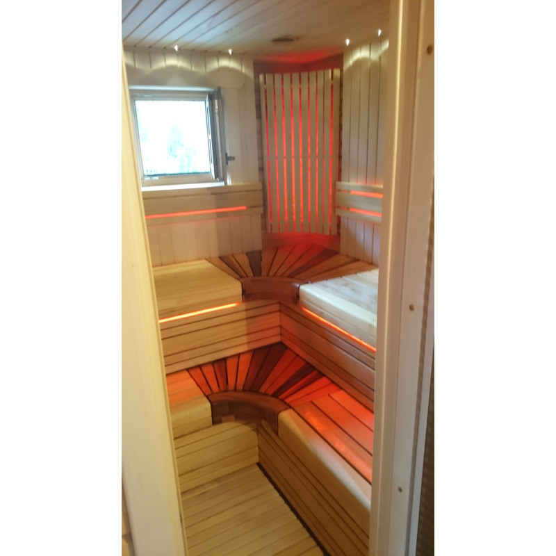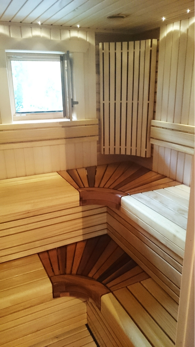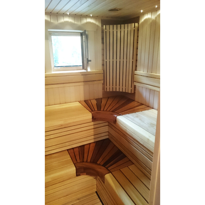 A szauna belseje a legjobb minőségű hárs- és cédrusfából, a padok abachi és cédrusfából készültek. Ez a fa a legalkalmasabb padoknak, mivel keveset melegszik fel, biztonságos és kellemes tapintású.