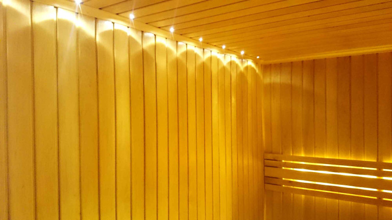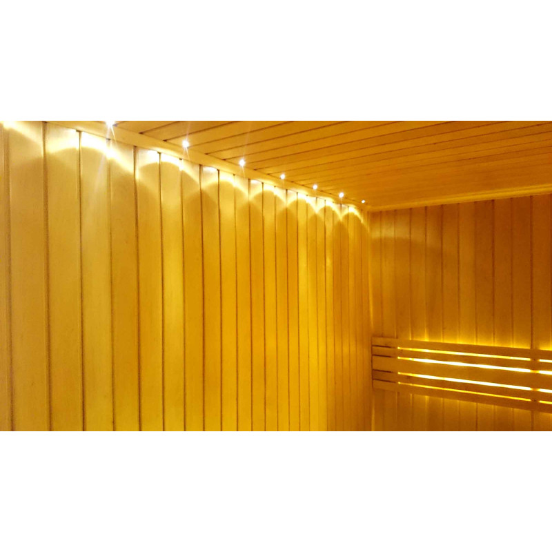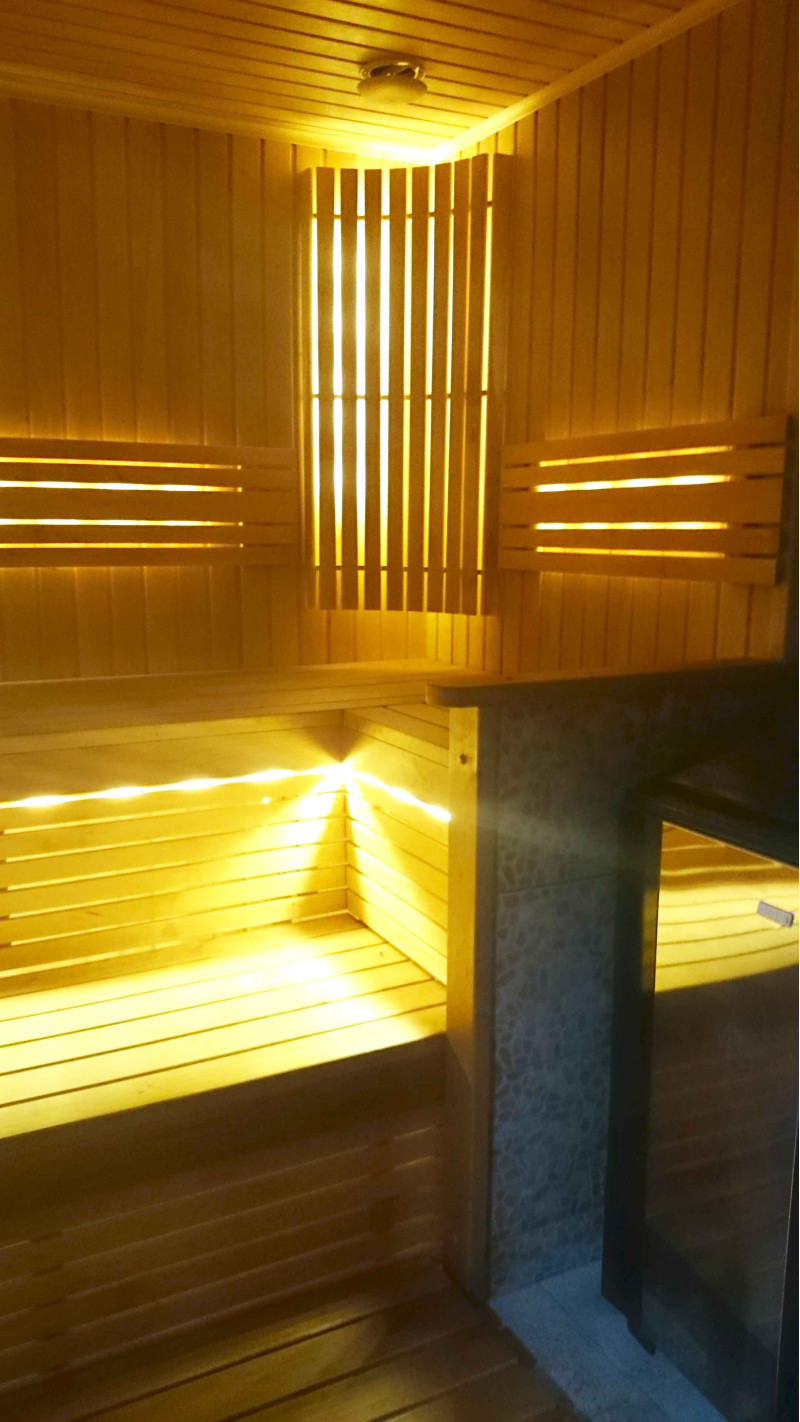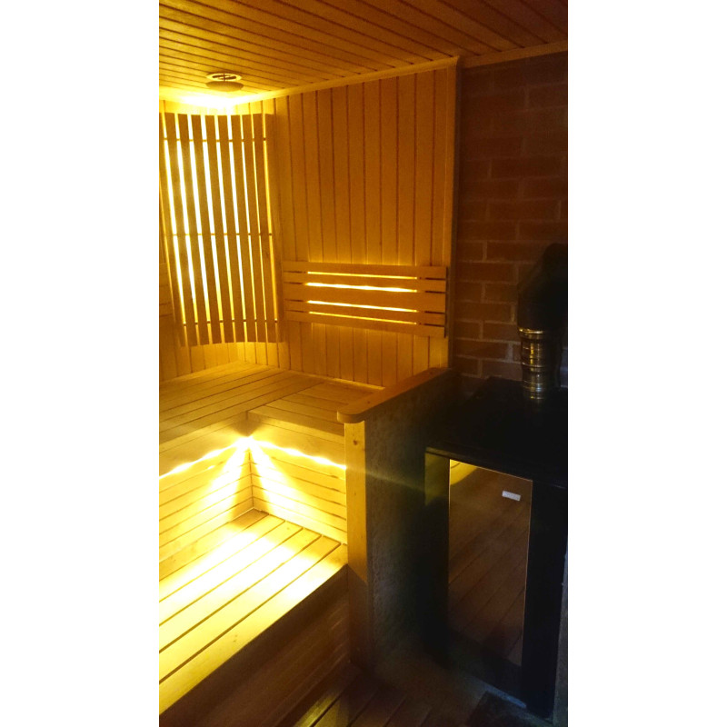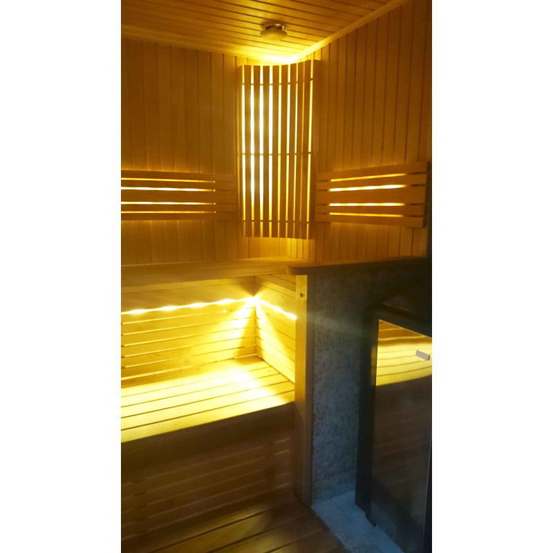 A szauna világítása nagyon fontos elem, mert a világítás az, ami a szauna relaxáló hatásának részét képezi. Ez a szauna LED lámpákkal van felszerelve a mennyezeten, a nyugágyak és a háttámlák alatt. A lámpatestek ellenállnak a nedvességnek és a magas hőmérsékletnek.