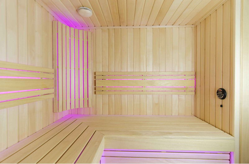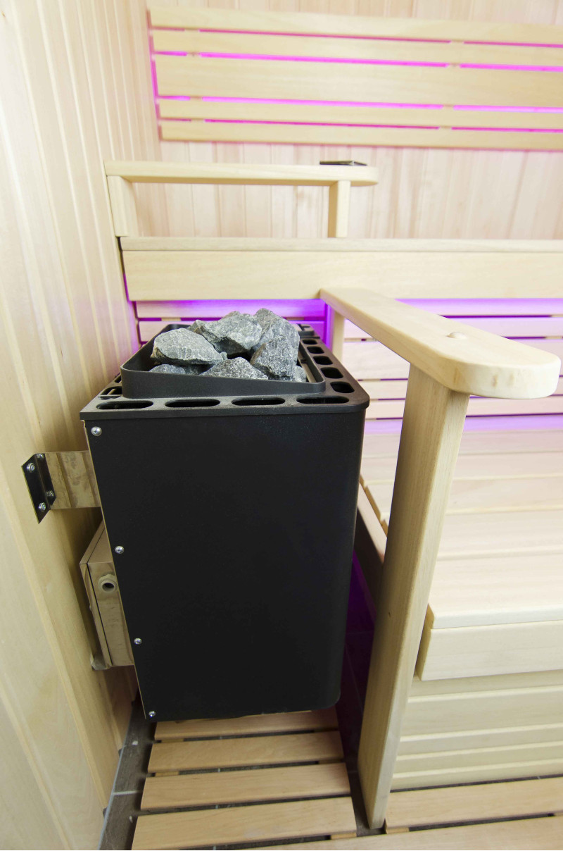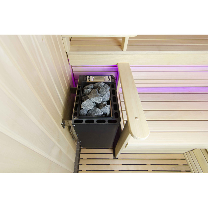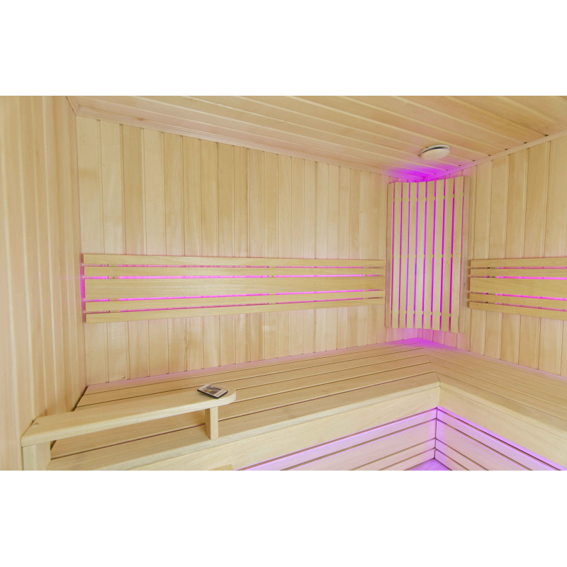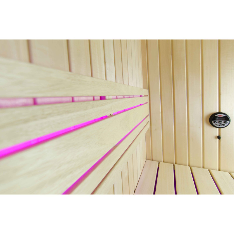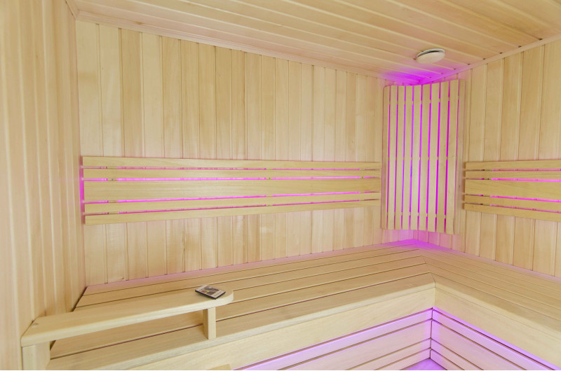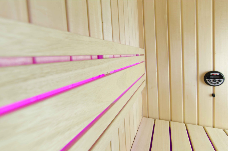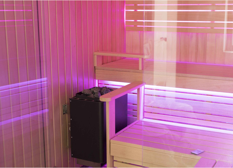 A szauna belseje a legmagasabb minőségű hársfából készült, a napozóágyak abachi fából készültek - nem fűtöttek és tökéletesek a szaunához.