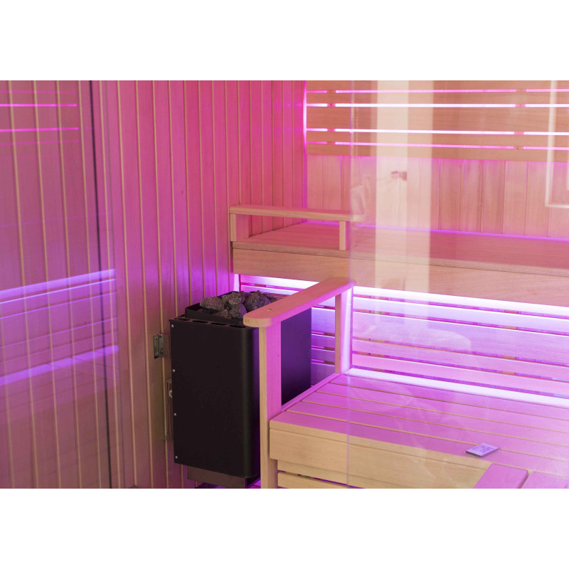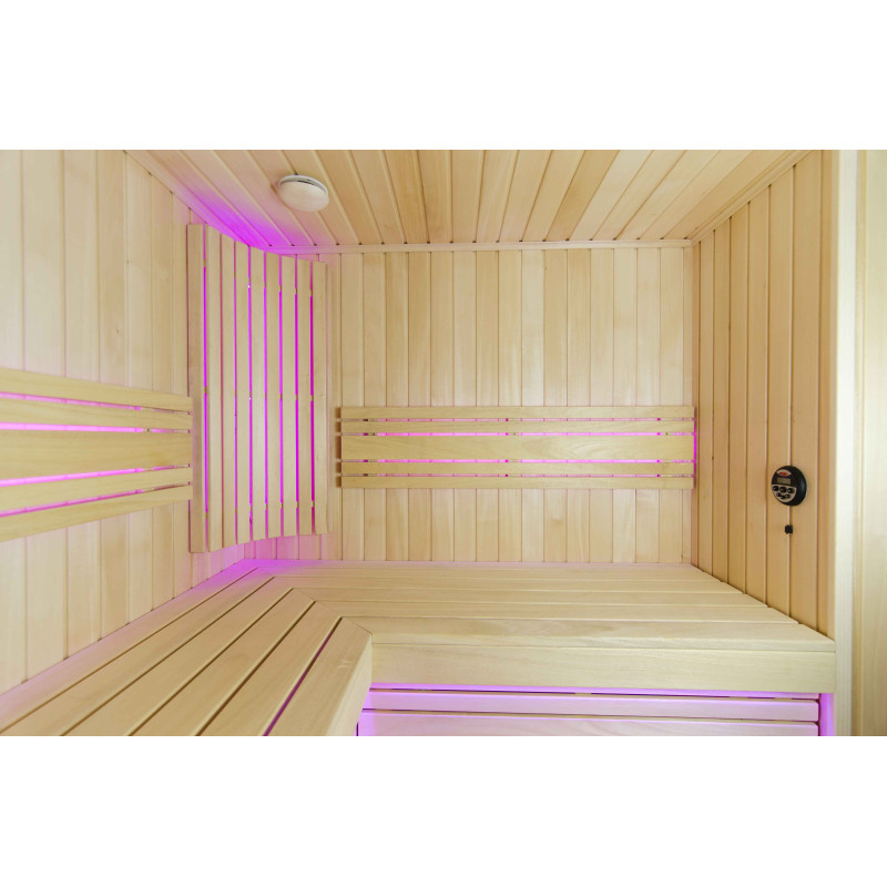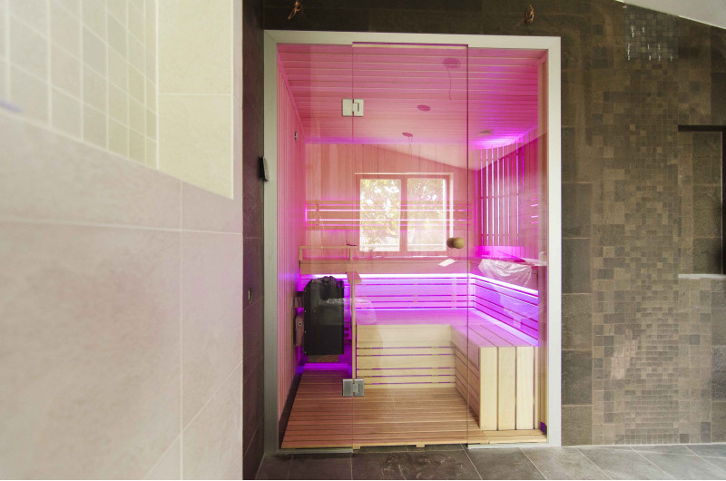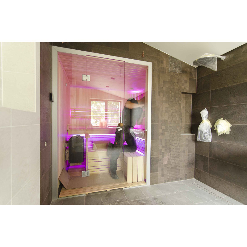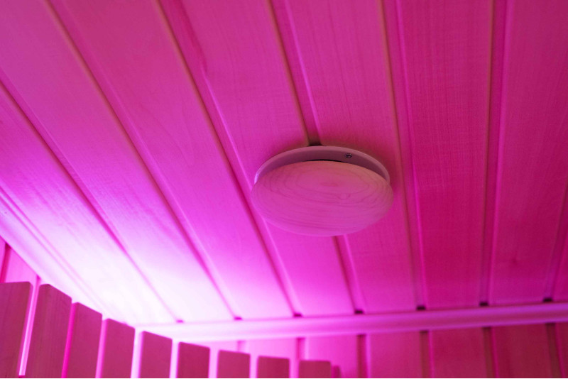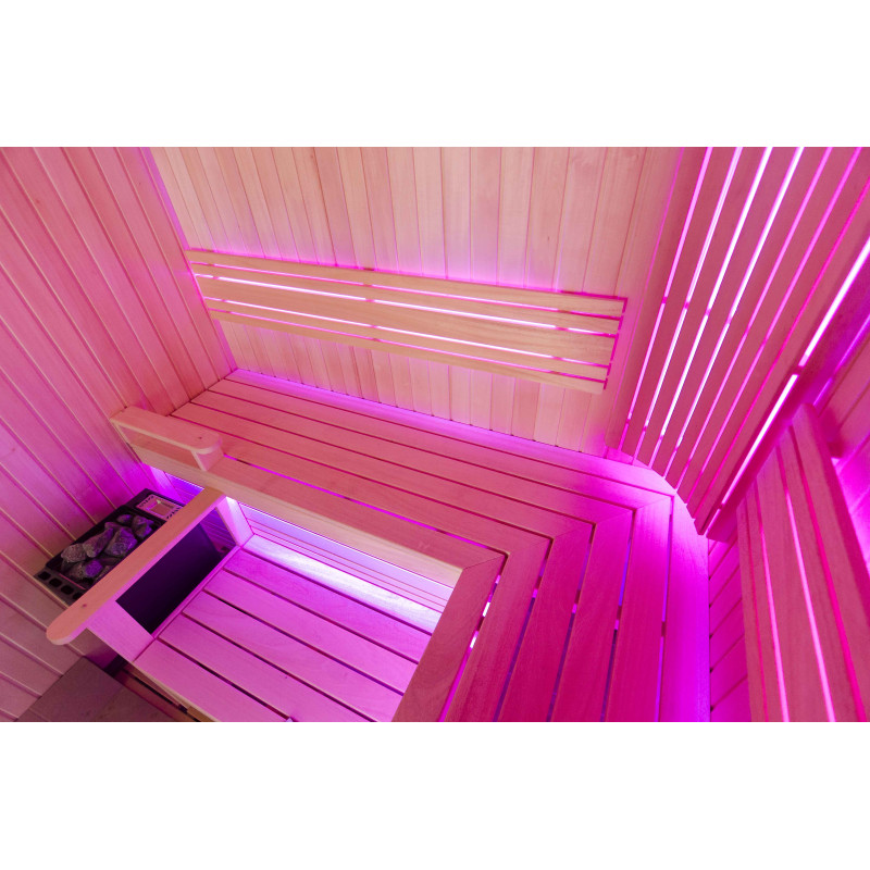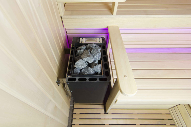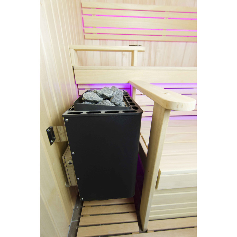 A szauna belseje a legmagasabb minőségű hársfából készült, a napozóágyak abachi fából készültek - nem fűtöttek és tökéletesek a szaunához.