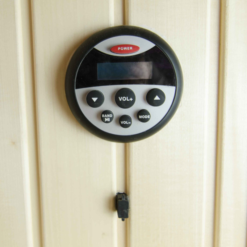 Modern, privát használatra szauna projektet valósítottak meg Melnrage -ben. A fürdőszobai sarokban volt egy sarok a családi szauna örömei számára. A szauna nagy ablakai a fürdőszoba ablakán keresztül a természetre nyílnak, biztosítva az állandó fényforrást és optikailag megnövelve a nem túl nagy szauna helyiségét. A nagyszerű kilátás mellett a szauna élvezetét fokozza a hang - beépített zenei berendezés. A médialejátszót kifejezetten forró, párás szaunában való használatra tervezték. USB csatlakozóval, Bluetooth, rádióval, LCD képernyővel, gumi vezérlőgombokkal rendelkezik. A hangszórók ellenállnak a szauna nedvességének, a korróziónak és a hőmérsékletnek is.
