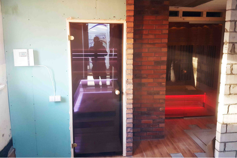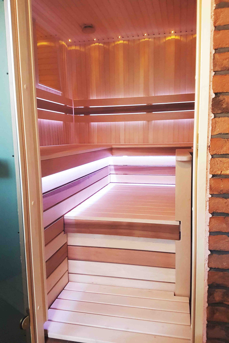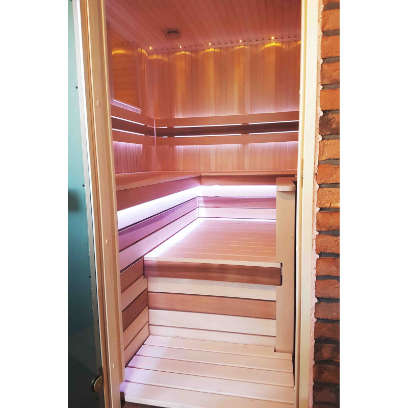 Nedvesség- és hőálló szauna világítás - LED "Sun" van felszerelve. A nyugágyak alatt és a háttámlákban színes RGB világítás távirányítós színváltóval vezérelve.
